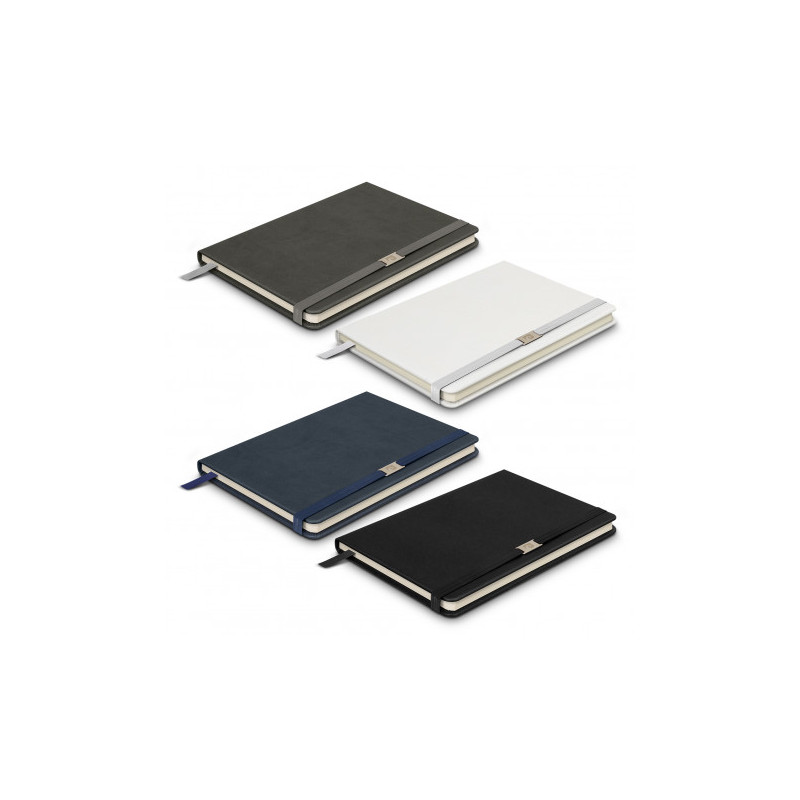 Quality notebook presented in a stylish giftbox. The notebook that has 80 leaves of cream lined 80gsm paper, with a thermo PU cover and an elastic band closure with a branded metal slider.