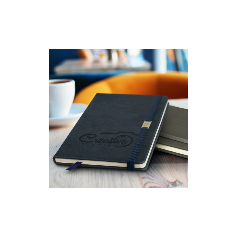 Exceptional A5 notebook with 70 leaves (140 pages) of 80gsm lined cream paper and a bookmark ribbon. It has a hard cover manufactured from recycled post-consumer polyester with an elastic closure and pen loop.