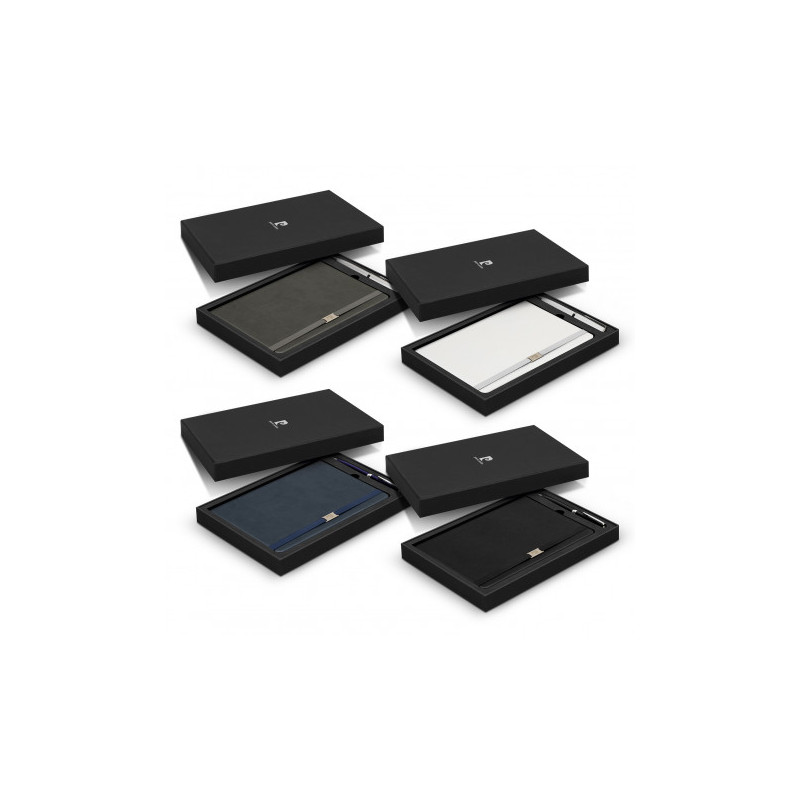 Quality notebook presented in a stylish giftbox. The notebook that has 80 leaves of cream lined 80gsm paper, with a thermo PU cover and a branded metal buckle.