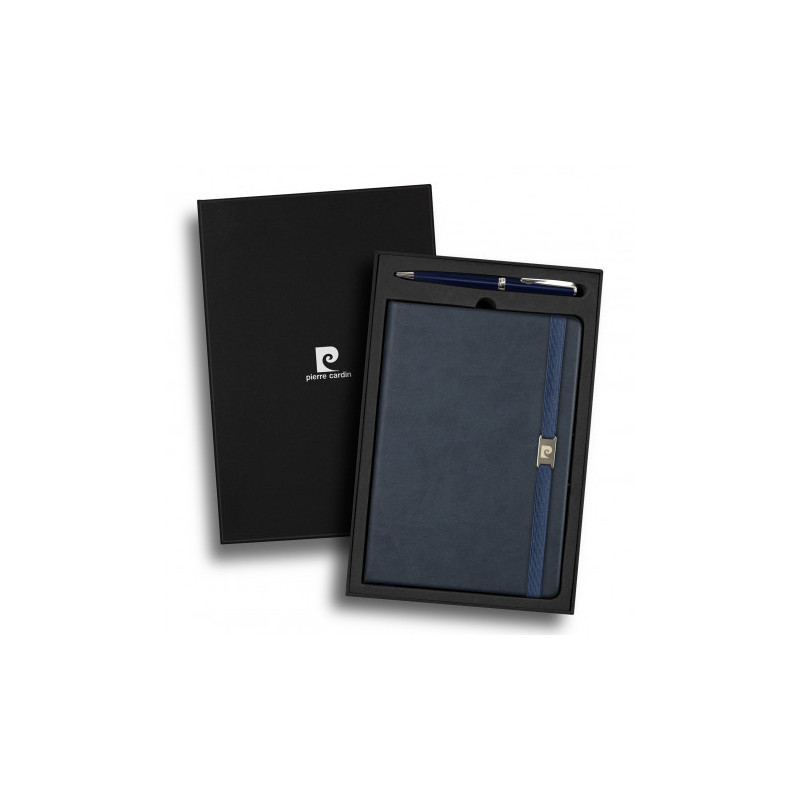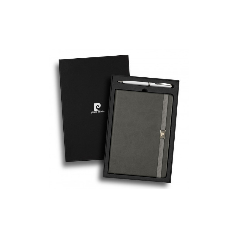 Stylish notebook and pen gift set. The notebook features 80 leaves of cream lined 80gsm paper and has a thermo PU cover with a branded metal buckle. Accompanying the notebook is a twist-action brass ballpoint pen with shiny chrome trim, and 4000m of black Dokumental ink. The notebook and pen are presented in a Pierre Cardin gift box.