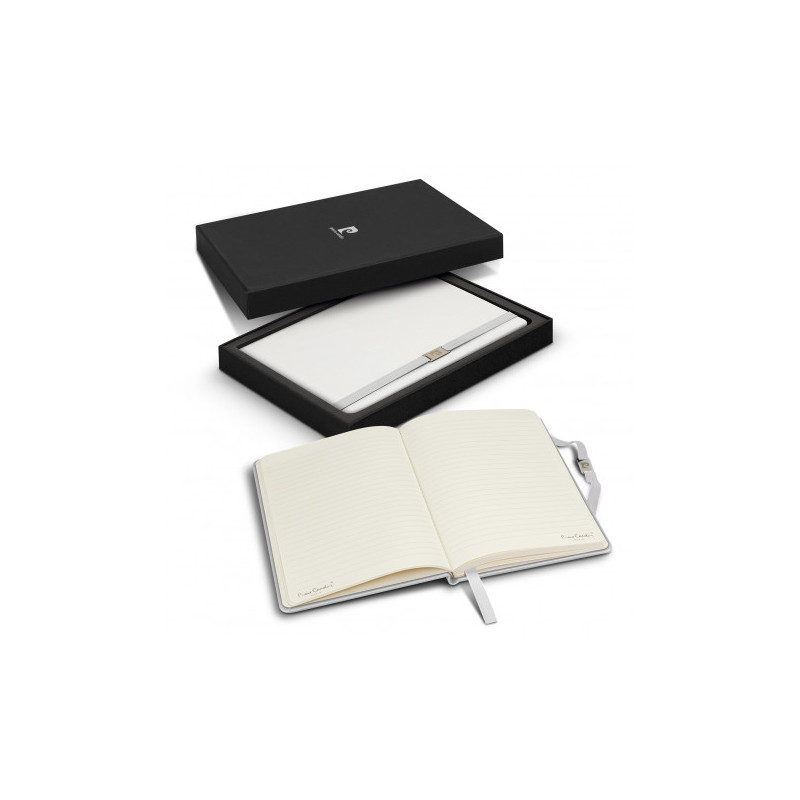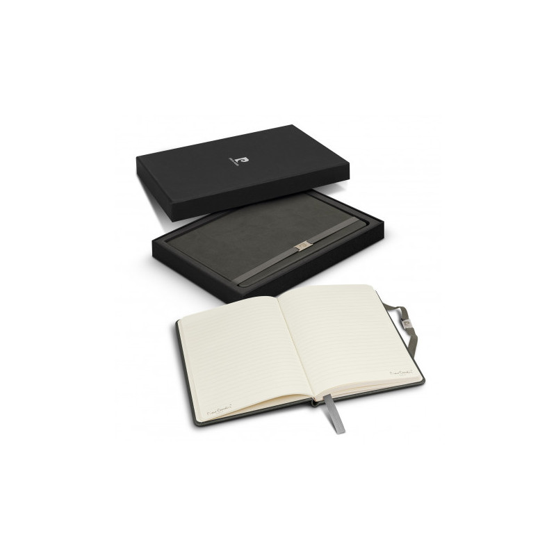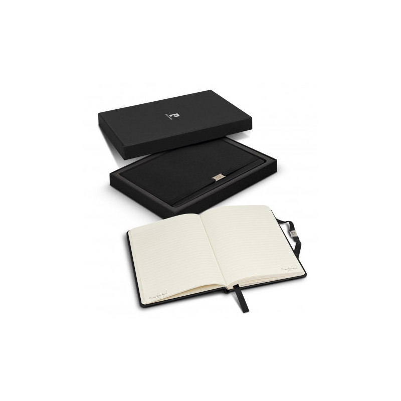 Quality notebook that has 80 leaves of cream lined 80gsm paper with a thermo PU cover and a branded metal buckle. The Pierre Cardin logo is debossed on the back cover of the notebook.