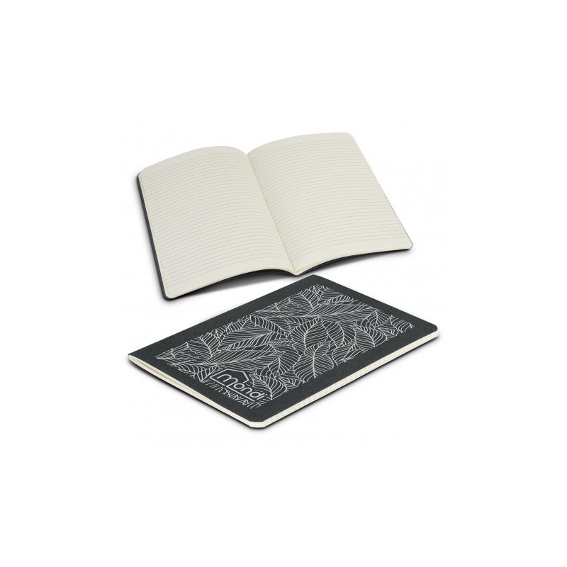 Exceptional A5 notebook with 70 leaves (140 pages) of 80gsm lined cream paper and a bookmark ribbon. It has a hard cover manufactured from recycled post-consumer polyester with an elastic closure and pen loop.