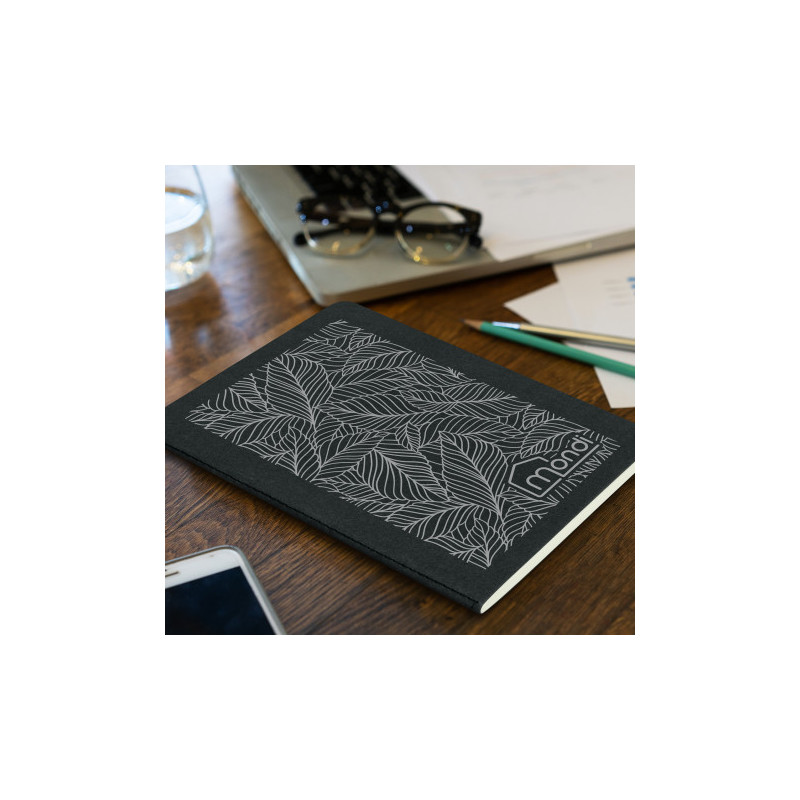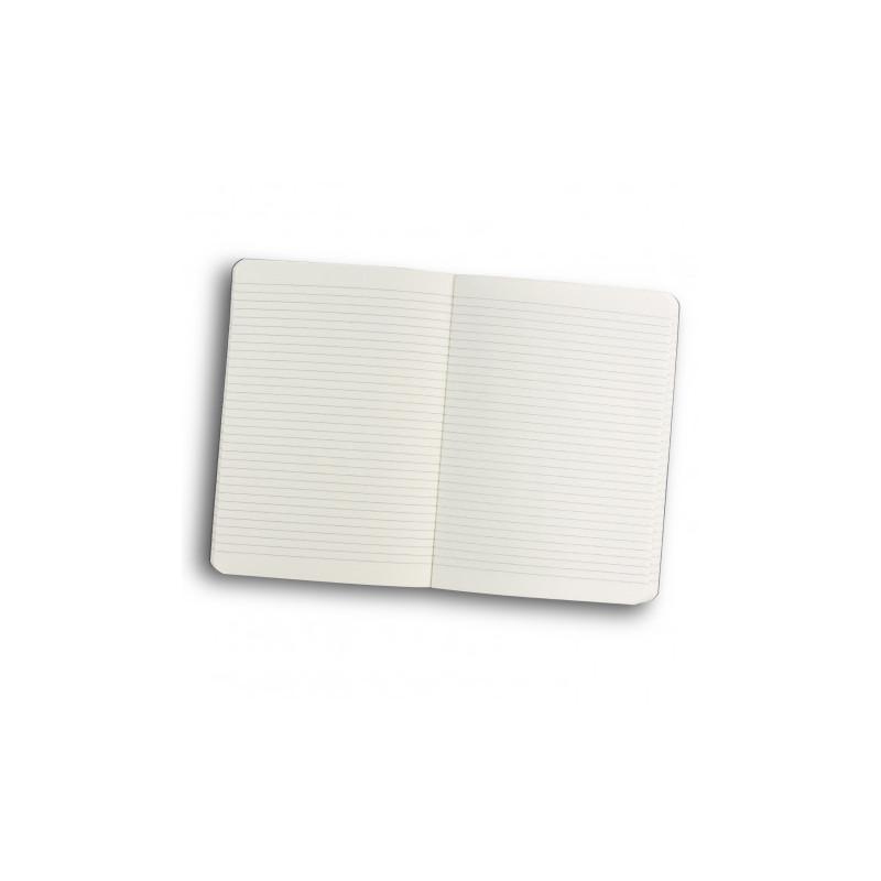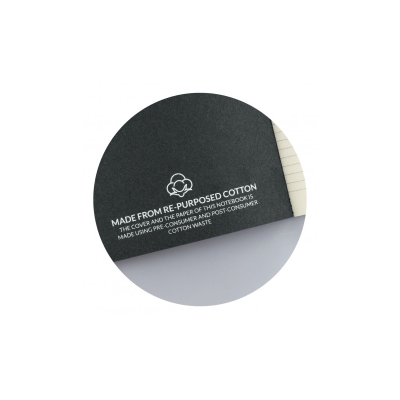 Exceptional A5 notebook with 70 leaves (140 pages) of 80gsm lined cream paper and a bookmark ribbon. It has a soft cover manufactured from recycled post-consumer polyester with an elastic closure.