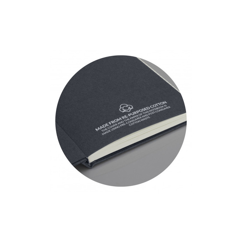 Exceptional A5 notebook with 70 leaves (140 pages) of 80gsm lined cream paper and a bookmark ribbon. It has a soft cover manufactured from recycled post-consumer polyester with an elastic closure.