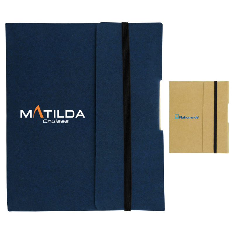 Jotter features recycled cover. Includes matching recycled barrel ballpoint pen. Elastic band closure and pen loop. 60 ruled pages. Pen imprint not available. Pens packed separately.