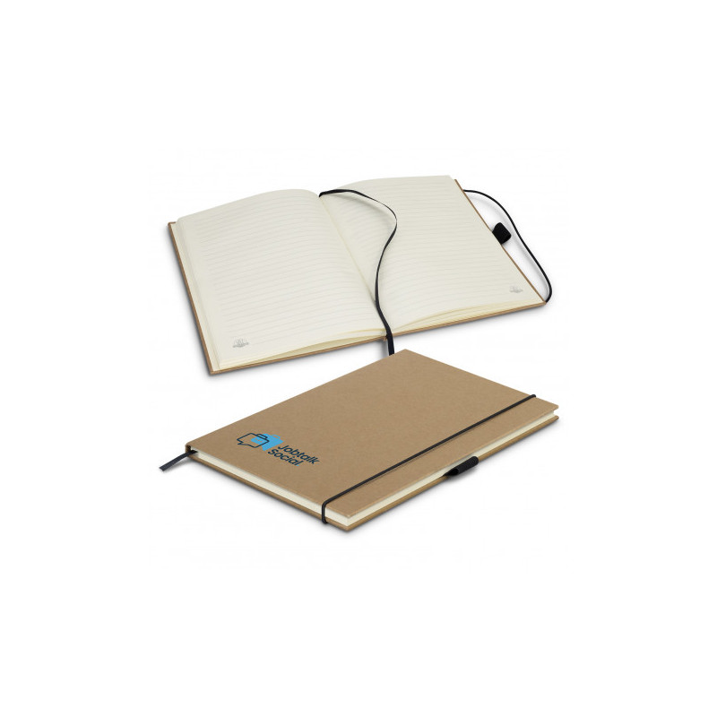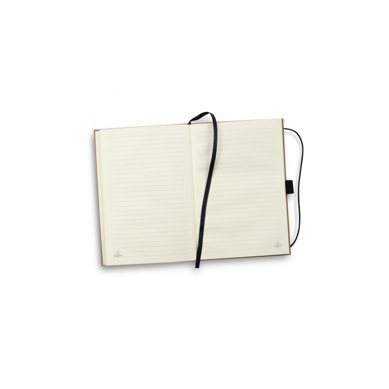 Exceptional A5 notebook with 70 leaves (140 pages) of 80gsm lined cream paper and a bookmark ribbon. It has a hard cover manufactured from recycled post-consumer polyester with an elastic closure and pen loop.