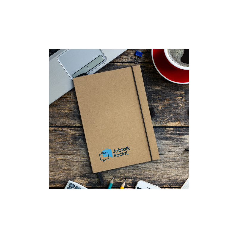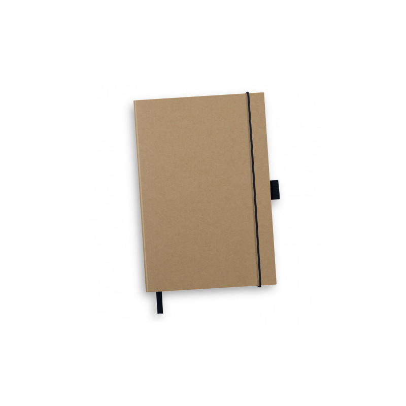 Smart medium-size notebook with 80 leaves (160 pages) of 70gsm lined and unlined kraft paper and a hard kraft paper cover. It features an elastic closure band, pen loop and a bookmark ribbon.
