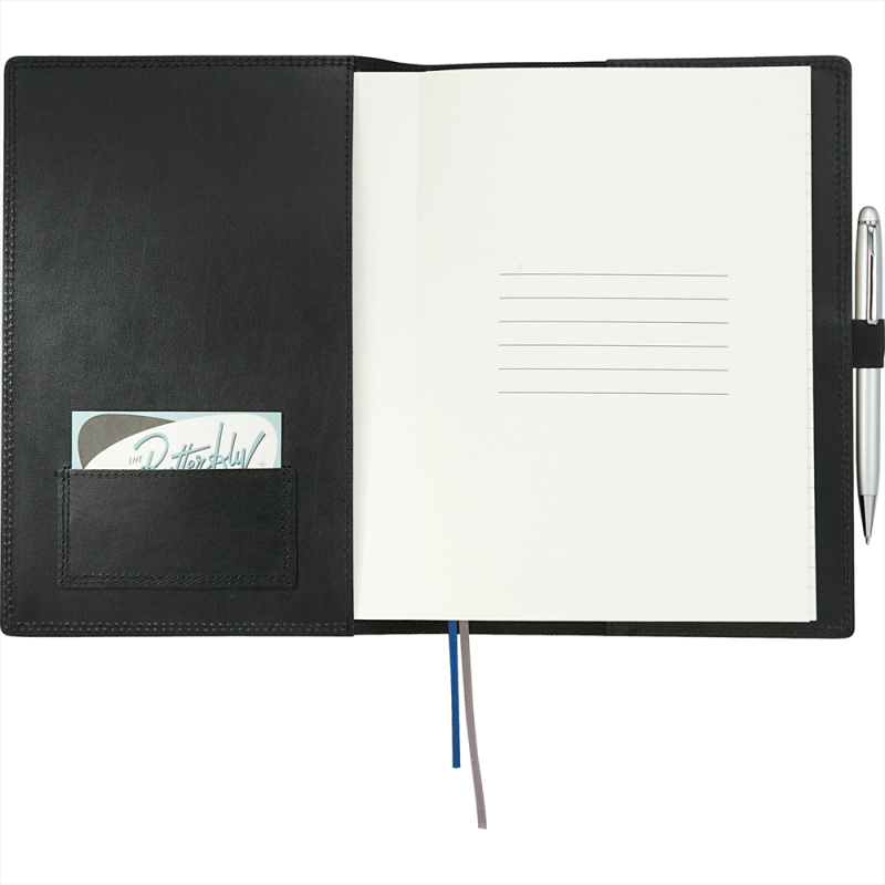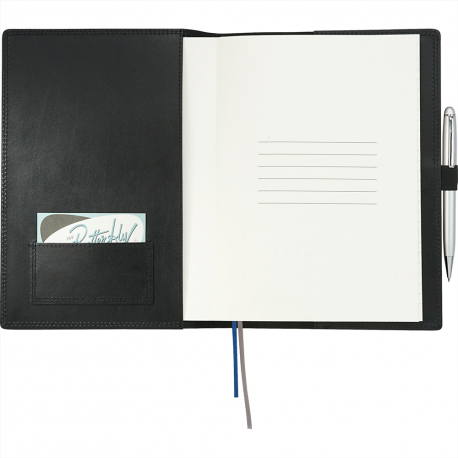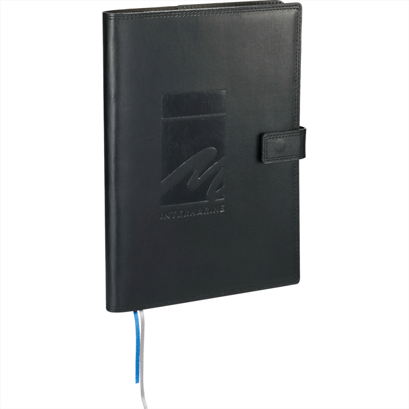 Quality notebook that has 80 leaves of cream lined 80gsm paper with a thermo PU cover and a branded metal buckle. The Pierre Cardin logo is debossed on the back cover of the notebook.