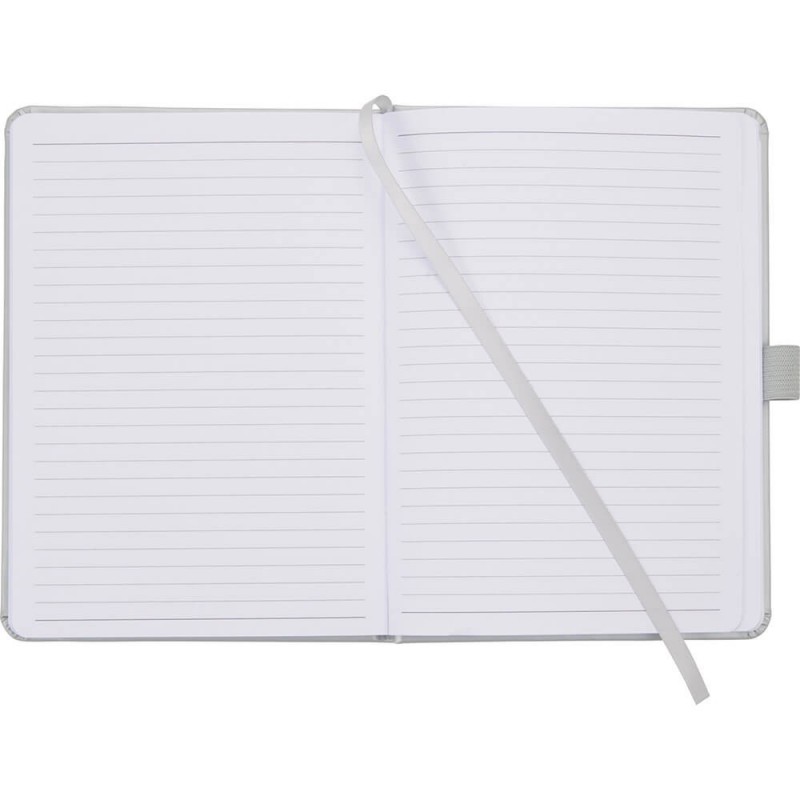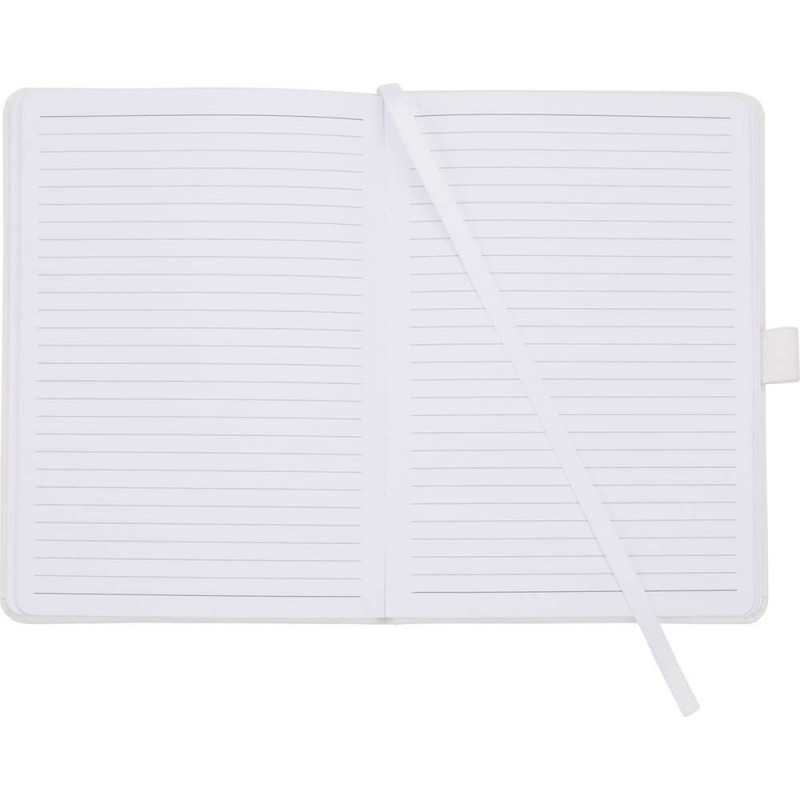 Exceptional A5 notebook with 70 leaves (140 pages) of 80gsm lined cream paper and a bookmark ribbon. It has a hard cover manufactured from recycled post-consumer polyester with an elastic closure and pen loop.