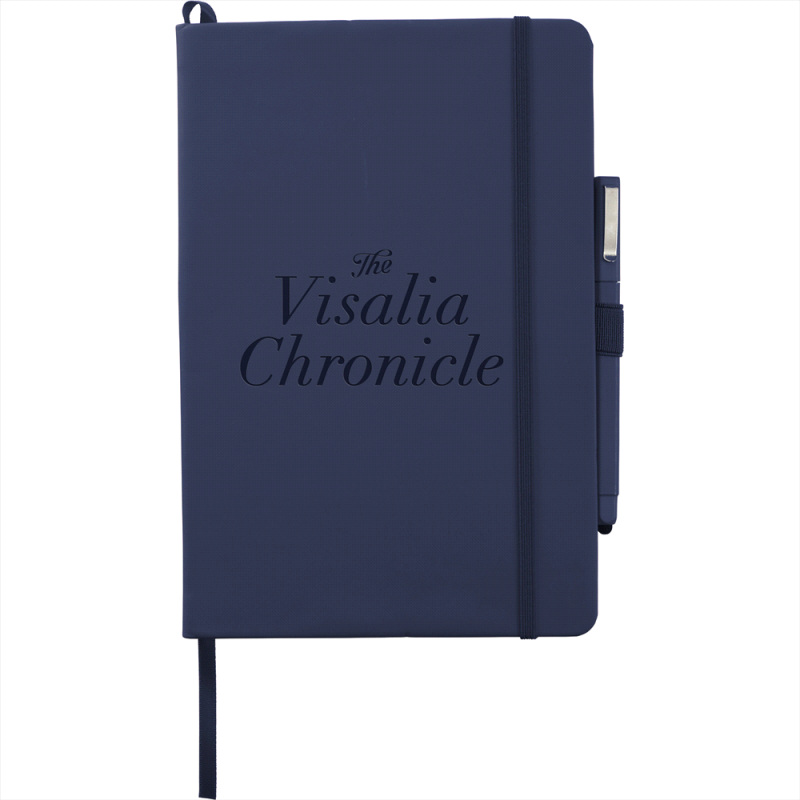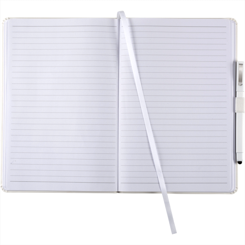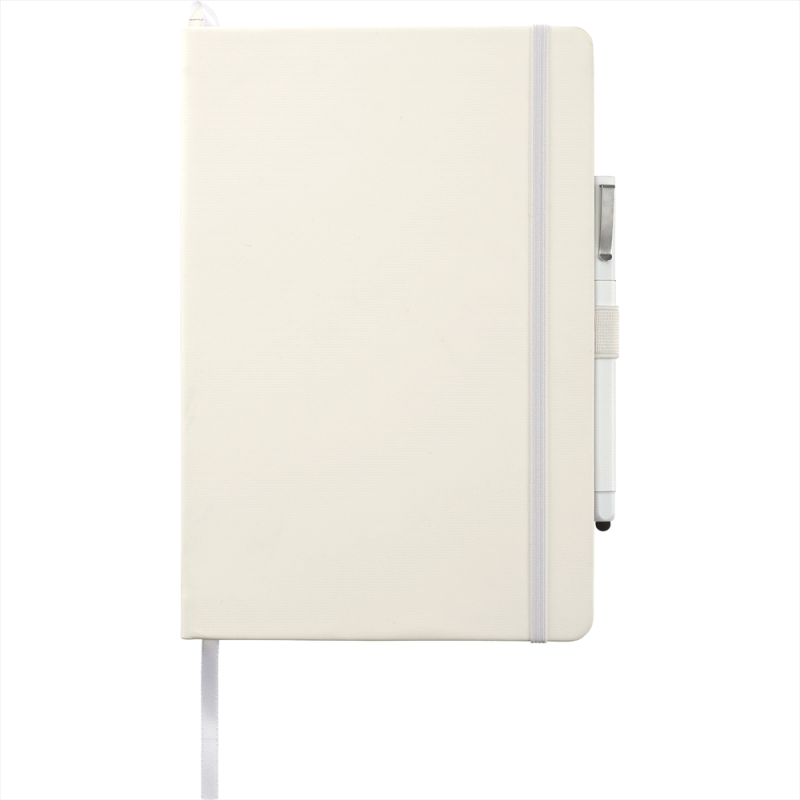 Jotter features recycled cover. Includes matching recycled barrel ballpoint pen. Elastic band closure and pen loop. 60 ruled pages. Pen imprint not available. Pens packed separately.