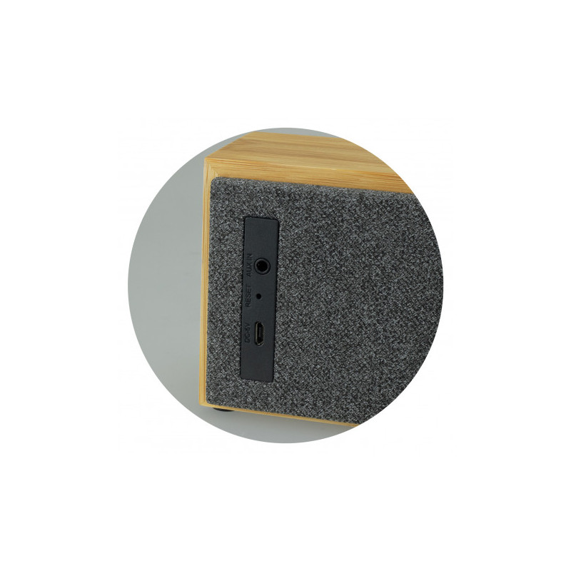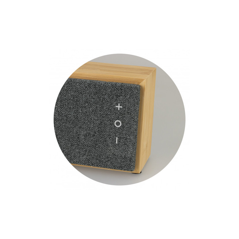 Stylish 3W Bluetooth speaker with limestone casing and a natural bamboo grill. The 500mAh battery will play music for up to 3 hours and recharges in 2.5 hours. Pause and play music controls are featured on the speaker base. The speaker is presented in Kraft packaging with Natura branding. A Micro-B USB cable and instructions are included.