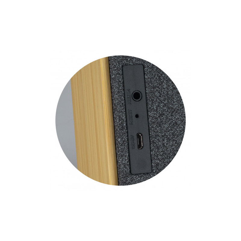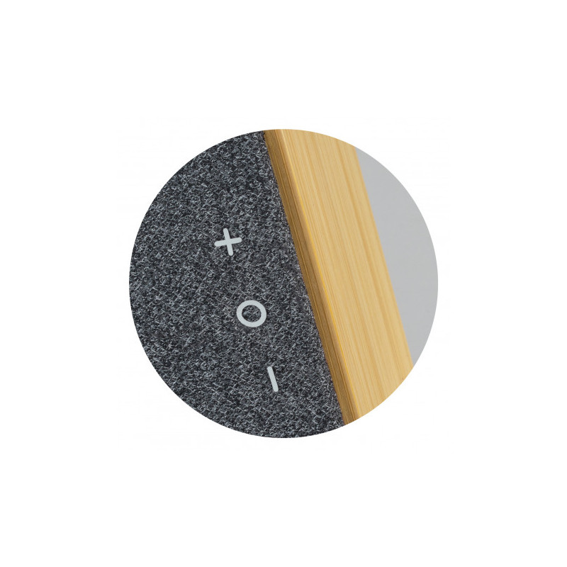 Stylish 3W Bluetooth speaker with limestone casing and a natural bamboo grill. The 500mAh battery will play music for up to 3 hours and recharges in 2.5 hours. Pause and play music controls are featured on the speaker base. The speaker is presented in Kraft packaging with Natura branding. A Micro-B USB cable and instructions are included.