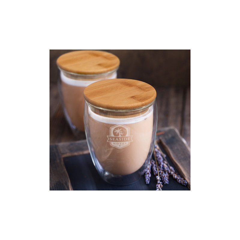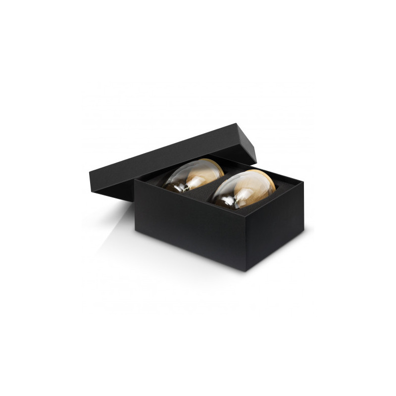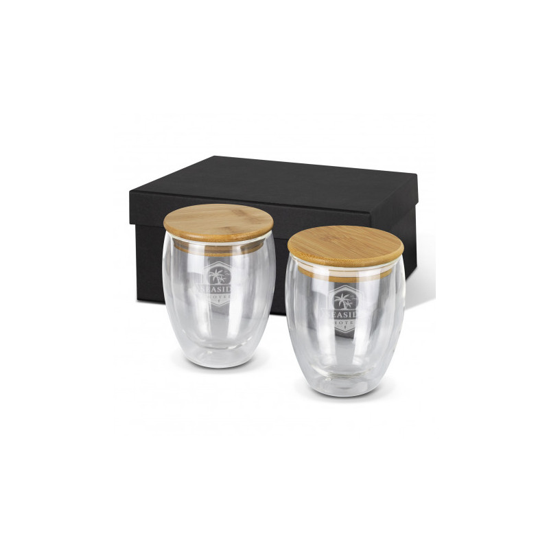 Stunning set of two 250ml Azzurra Glass Cups. These premium cups are made from double-wall, shatter-resistant borosilicate glass and feature a natural bamboo lid with a silicone seal. The cups are presented in a premium black gift box and are an elegant gifting solution.