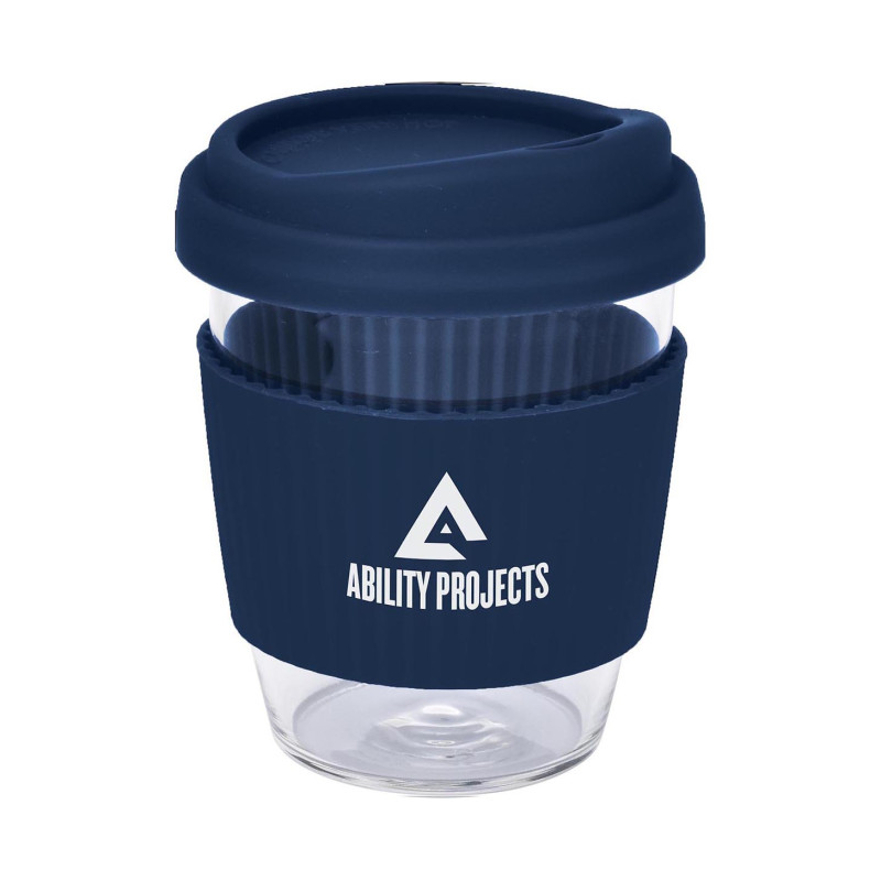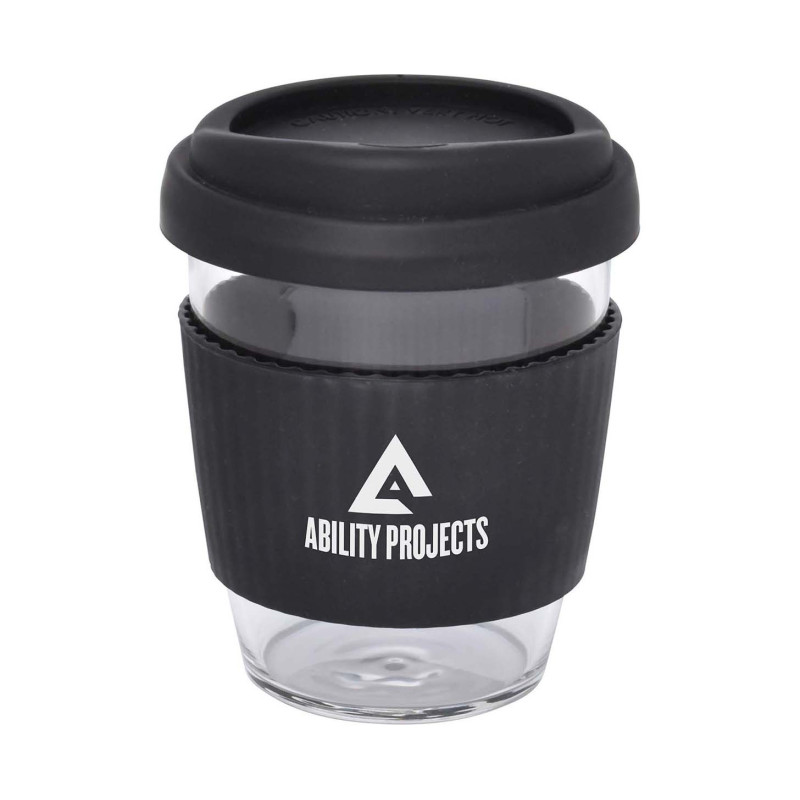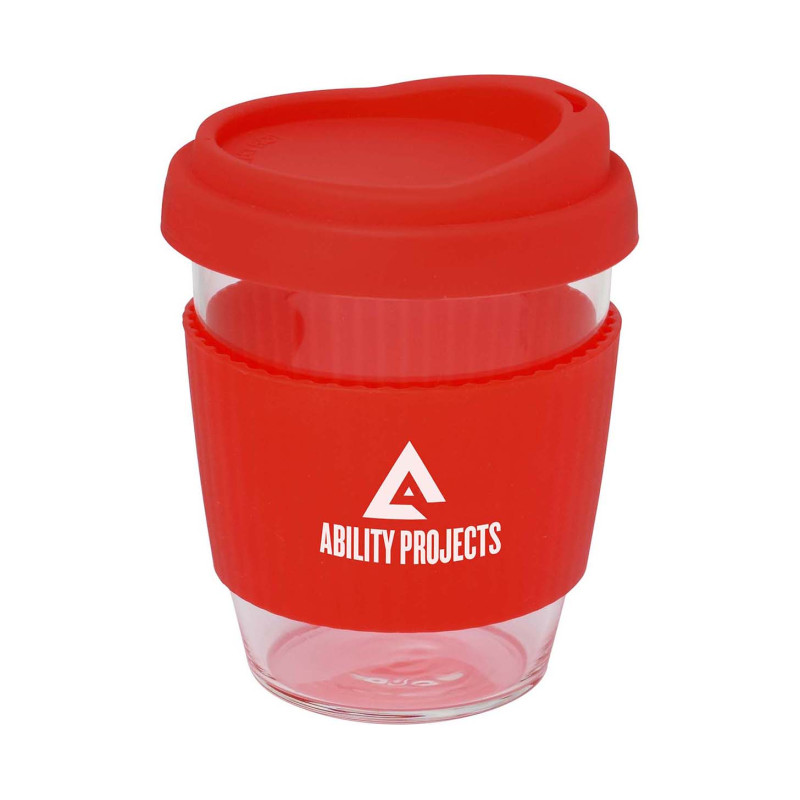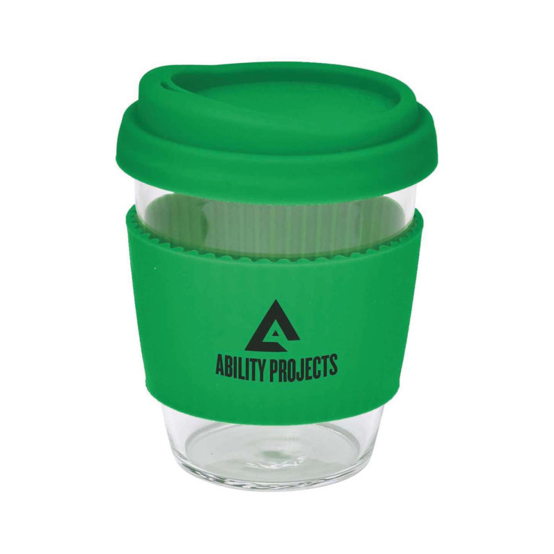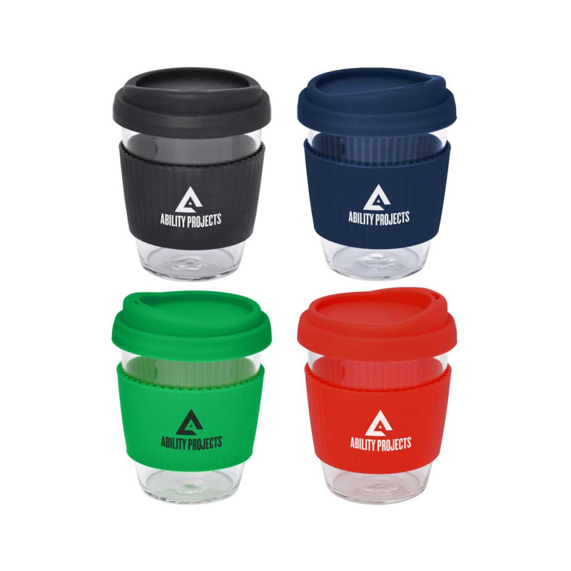 340ml glass coffee cup with push down PE lids and silicone bands available in a range of colours. Available in 6 colours or mix-and-match lids and sleeves in up to 36 combinations.