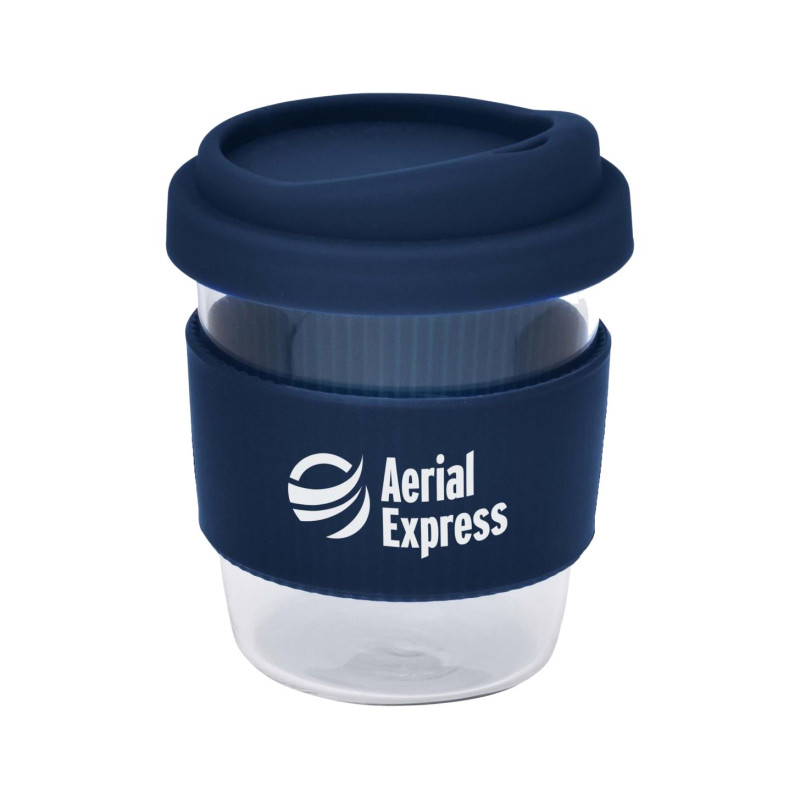 340ml glass coffee cup with push down PE lids and silicone bands available in a range of colours. Available in 6 colours or mix-and-match lids and sleeves in up to 36 combinations.