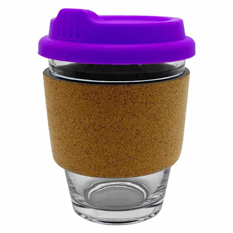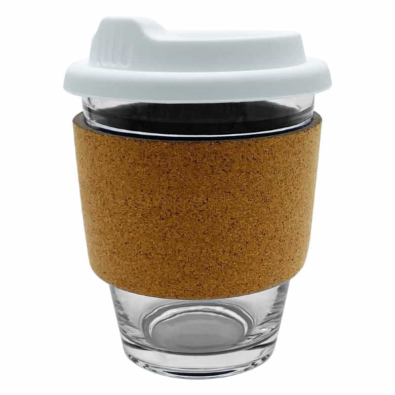 320ml glass reusable coffee cup. Heat-resistant cork band and secure fitting lid. Made from Borosilicate glass known for its durability and thermal shock resistance. Select your choice of lid and flip piece colour. Packed in a kraft gift box. For logo longevity, hand washing is recommended. Eco Credentials: Reusable, sustainable, printed using renewable...