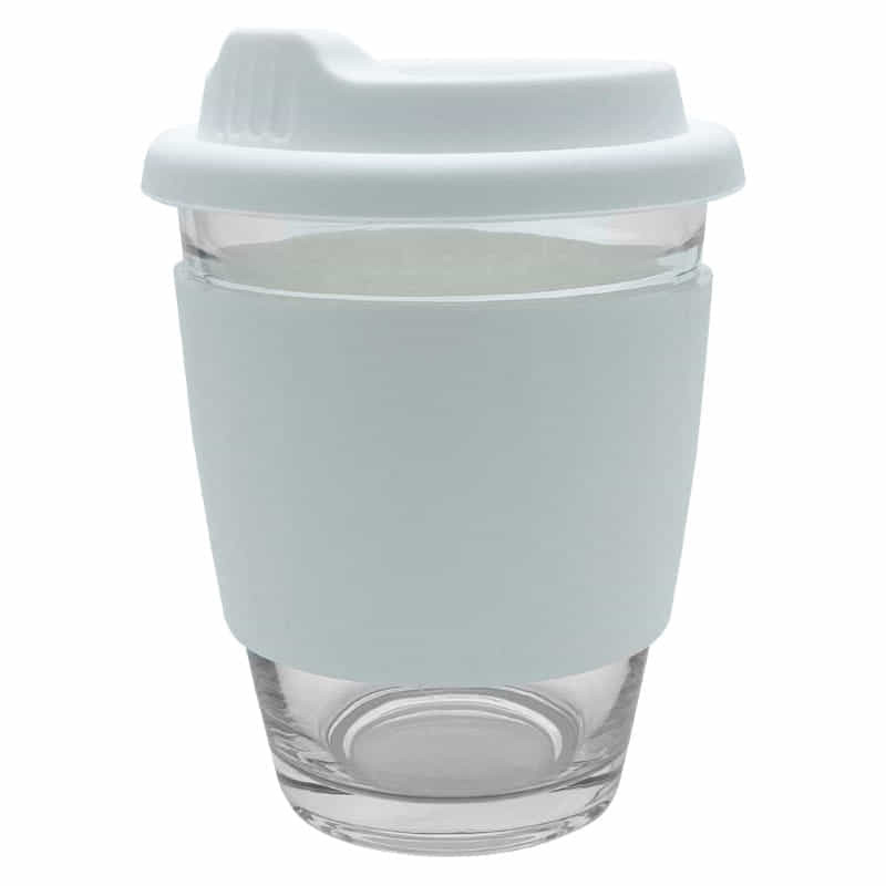 Elegant 250ml reusable borosilicate glass coffee cup with a secure push on plastic lid with silicone seal and a wide heat-resistant silicone band. Borosilicate is lightweight, exceptionally strong and shatter-resistant. It is a BPA-free choice for a clean, pure taste and is a natural alternative to single-use paper cups. The lid and band can be mixed and...