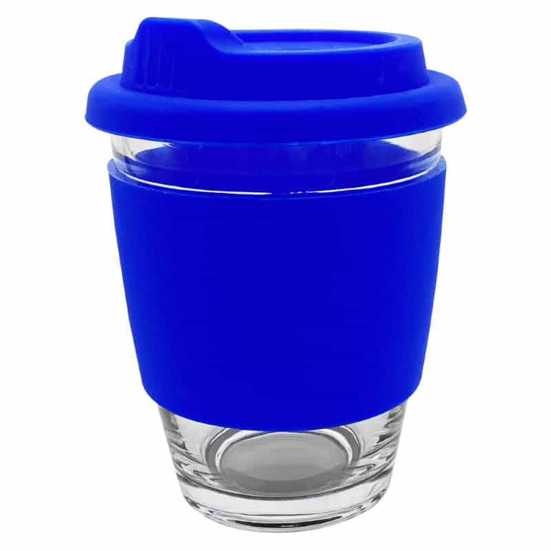 340ml glass coffee cup with push down PE lids and silicone bands available in a range of colours. Available in 6 colours or mix-and-match lids and sleeves in up to 36 combinations.