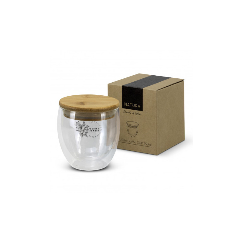 Stylish 350ml double-wall, shatter-resistant borosilicate glass coffee cup featuring a natural bamboo lid with a silicone seal. Azzurra is presented in natural packaging with NATURA branding.