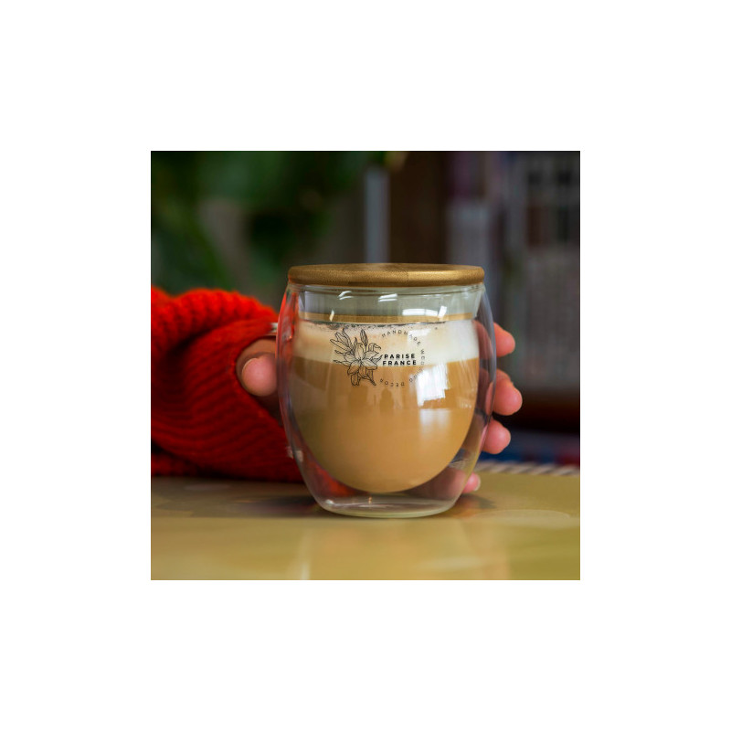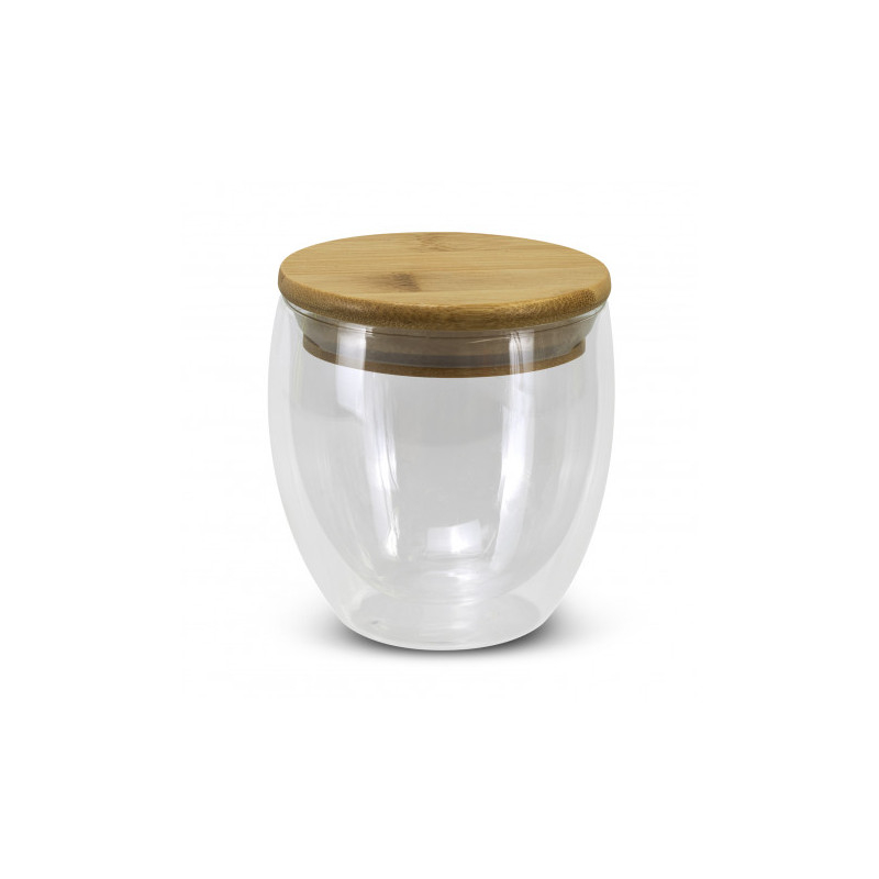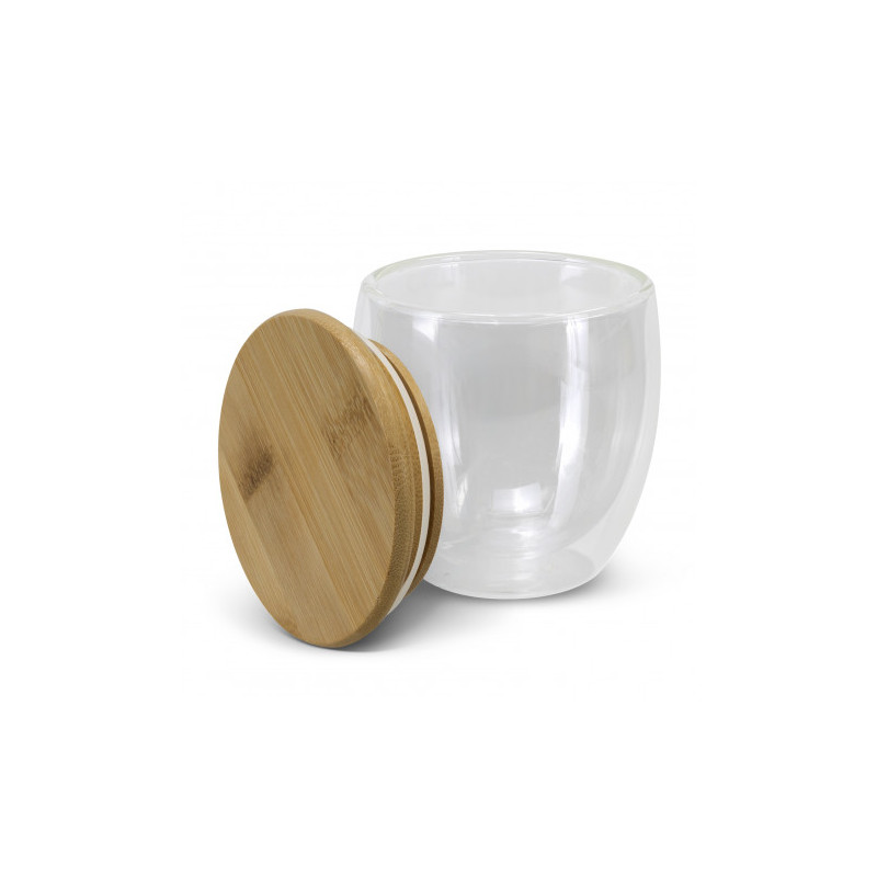Stunning set of two 250ml Azzurra Glass Cups. These premium cups are made from double-wall, shatter-resistant borosilicate glass and feature a natural bamboo lid with a silicone seal. The cups are presented in a premium black gift box and are an elegant gifting solution.