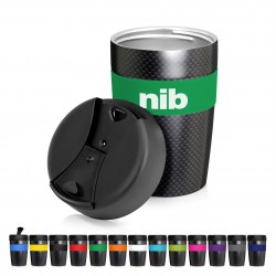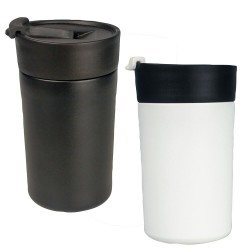 Stylish 350ml double-wall, vacuum insulated stainless steel mug with a tough powder coated finish. It has an ergonomic, curved silhouette, features a transparent push on lid with a colour-matched flip closure, and is presented in a natural gift box.