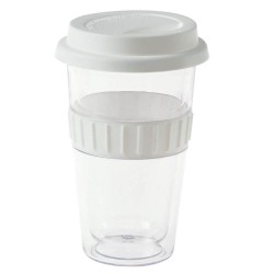 AS plastic clear mugs with silicone sleeve and lid. BPA Free. 350ml capacity.