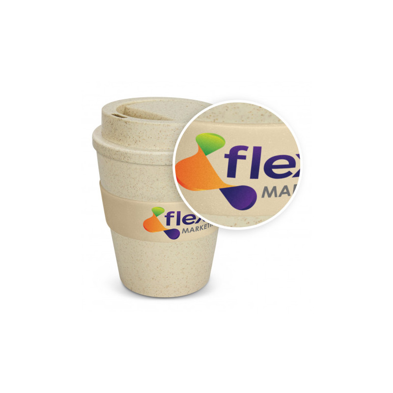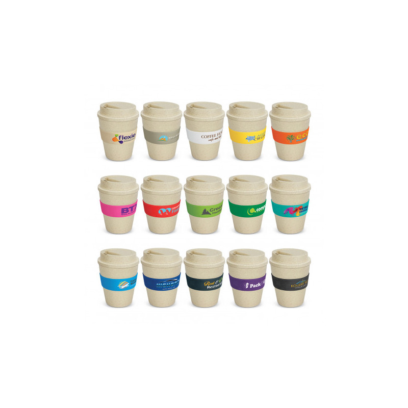 320ml reusable coffee cup. Made from 50% blend of wheat fibre and BPA free polypropylene. Includes heat resistant silicone sleeve and screw on lid. Select your choice of flip lid and silicone sleeve colours. For logo longevity hand washing is recommended. Eco Credentials: Reusable, sustainable, printed using renewable energy.