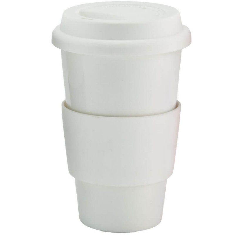 This practical design of a reusable coffee cup is 350ml and comes with a heat resistant ribbed silicone band with a flat section for decoration. Made from 50% bamboo and 50% polypropylene.