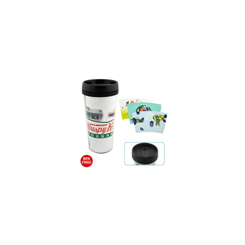 350ml double walled hot/cold cup with secure fitting comfort lid. BPA free. Microwave safe. These mugs have a coloured translucent outer layer over a solid white inner lining. For logo longevity, hand washing is recommended. Mix and match lid and cap colours. Eco Credentials: Reusable, sustainable, printed using renewable energy.