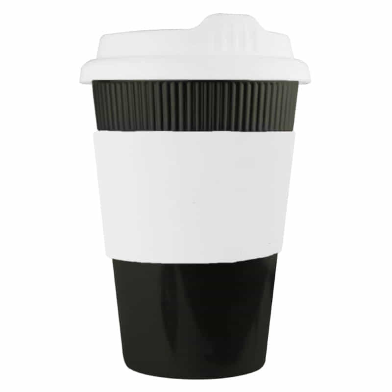 This practical design of a reusable coffee cup is 350ml and comes with a heat resistant ribbed silicone band with a flat section for decoration. Made from 50% bamboo and 50% polypropylene.