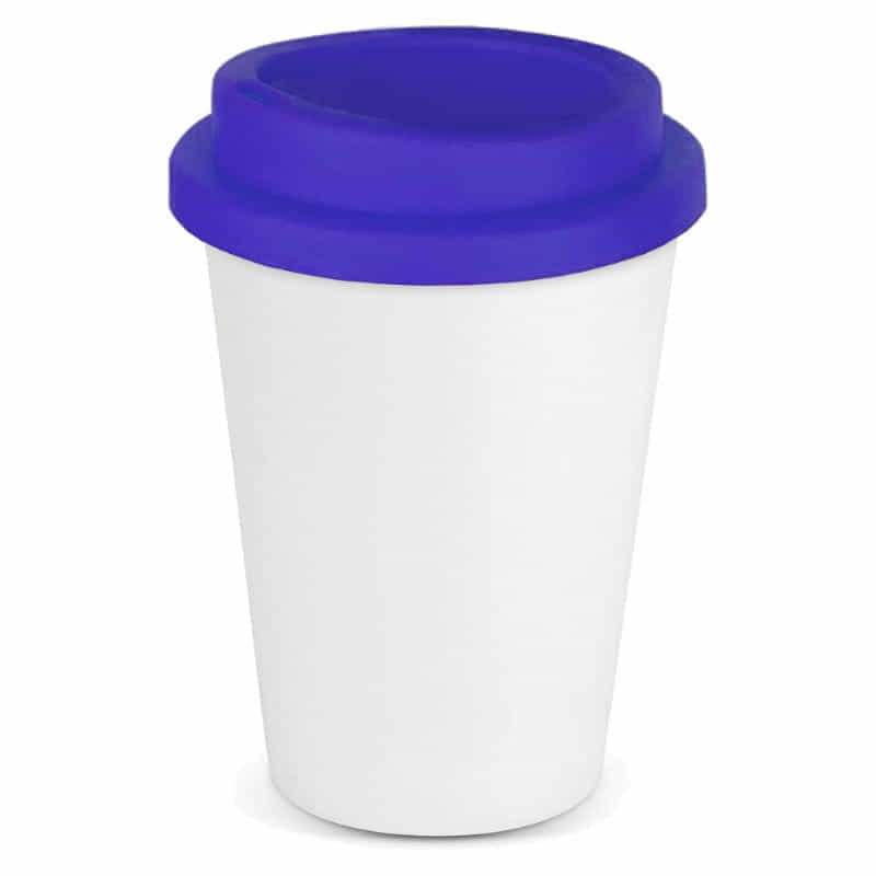 350ml double walled hot/cold cup with secure fitting comfort lid. BPA free. Microwave safe. These mugs have a coloured translucent outer layer over a solid white inner lining. For logo longevity, hand washing is recommended. Mix and match lid and cap colours. Eco Credentials: Reusable, sustainable, printed using renewable energy.