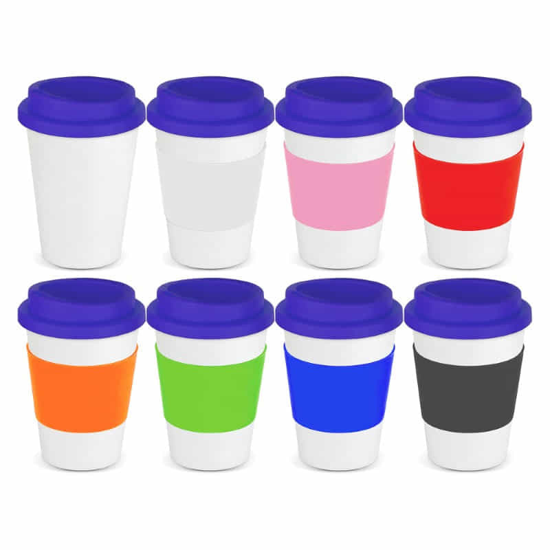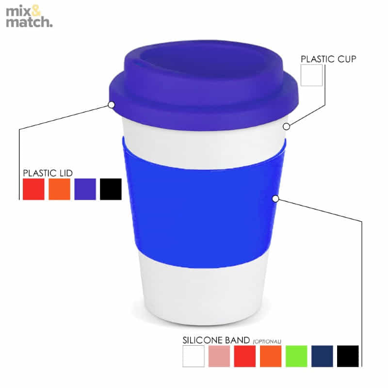 360ml cup made from BPA free Tritan material with push down PE lids and silicone bands. Available in 6 colours or mix-and-match lids and sleeves in up to 36 combinations.