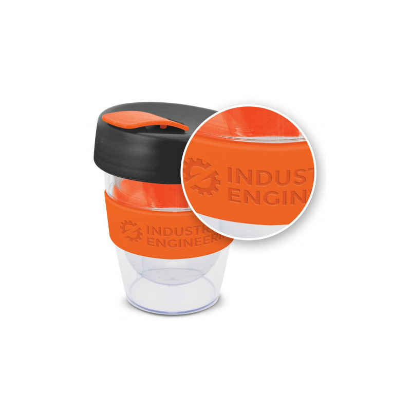 320ml clear reusable coffee cup. Includes heat resistant silicone sleeve and screw on lid. Select your choice of lid and silicone sleeve colours. BPA free. For logo longevity hand washing is recommended. Eco Credentials: Reusable, sustainable, printed using renewable energy.