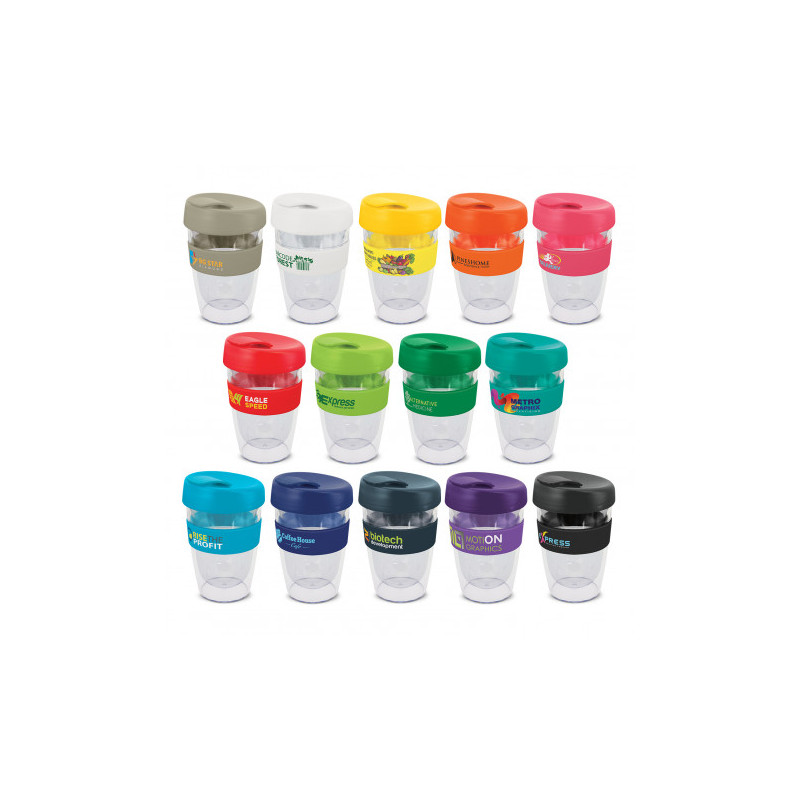 360ml cup made from BPA free Tritan material with push down PE lids and silicone bands. Available in 6 colours or mix-and-match lids and sleeves in up to 36 combinations.