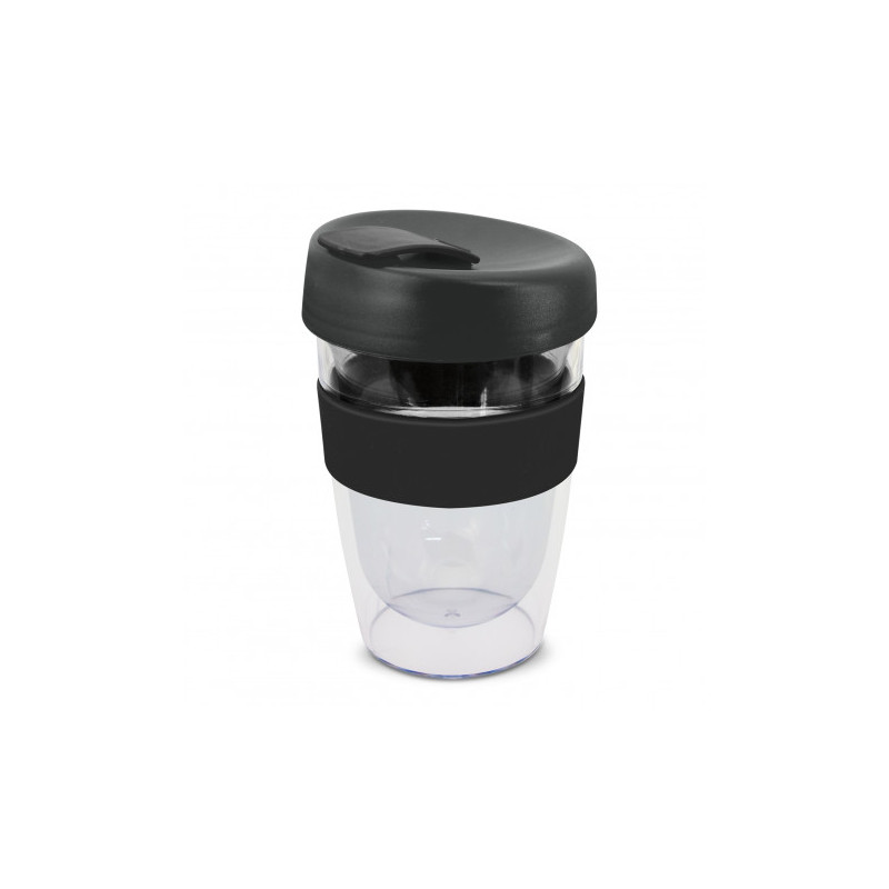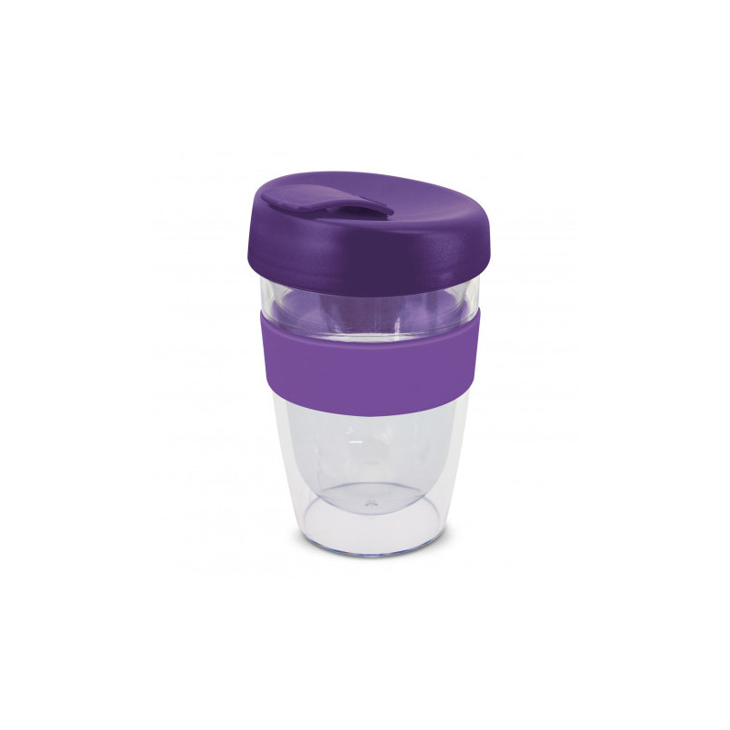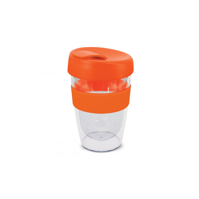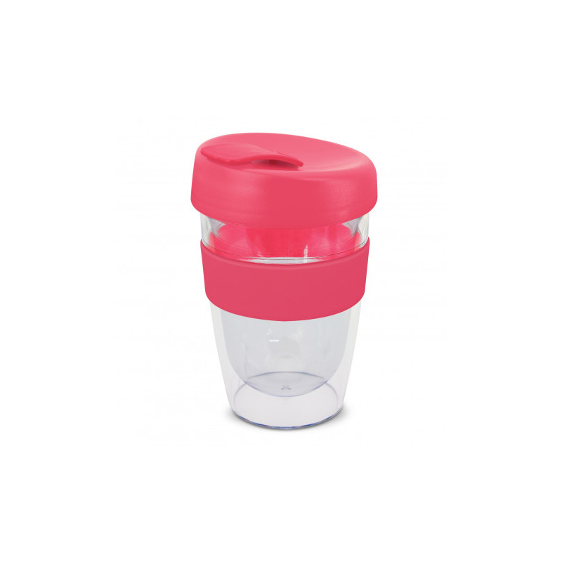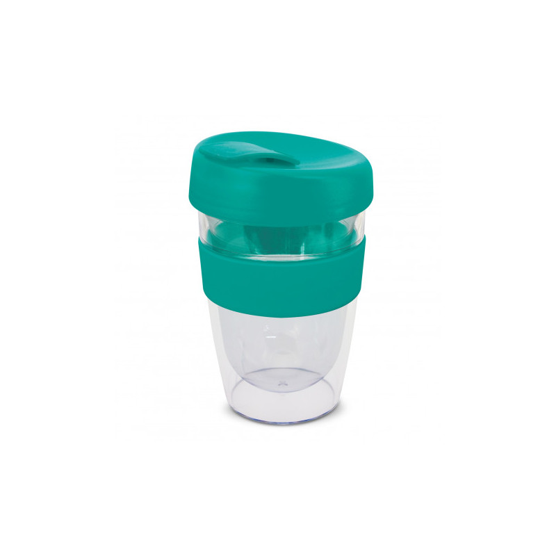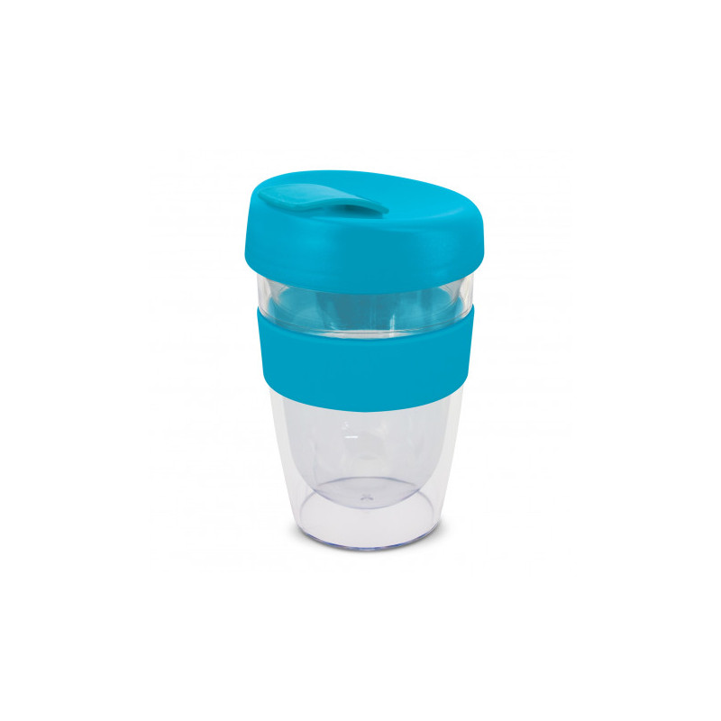 Reusable 230ml double wall coffee cup which will keep drinks hot for longer. It has a silicone band and a secure screw on lid with a splashproof flip closure. The cup is manufactured from crystal-clear AS plastic and the lid is polypropylene. Both materials are BPA-free. The lid, flip closure and band can be mixed and matched in any colour combination...