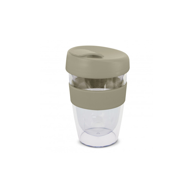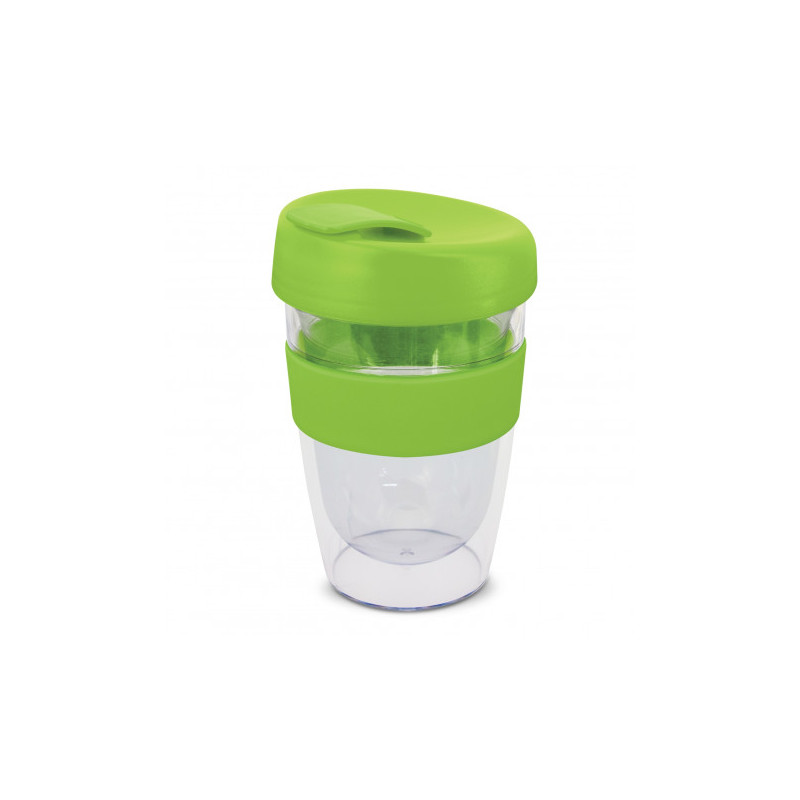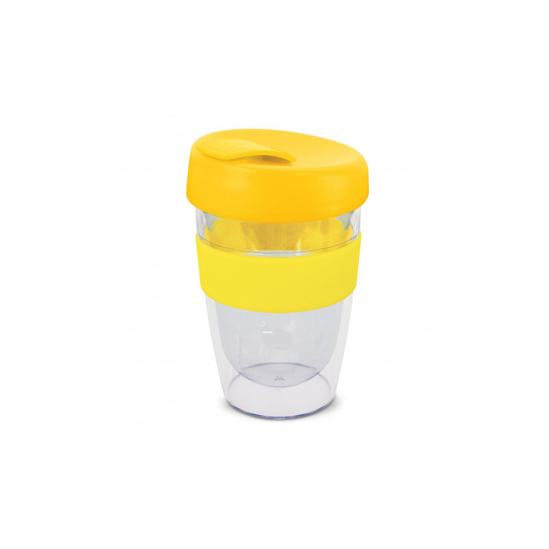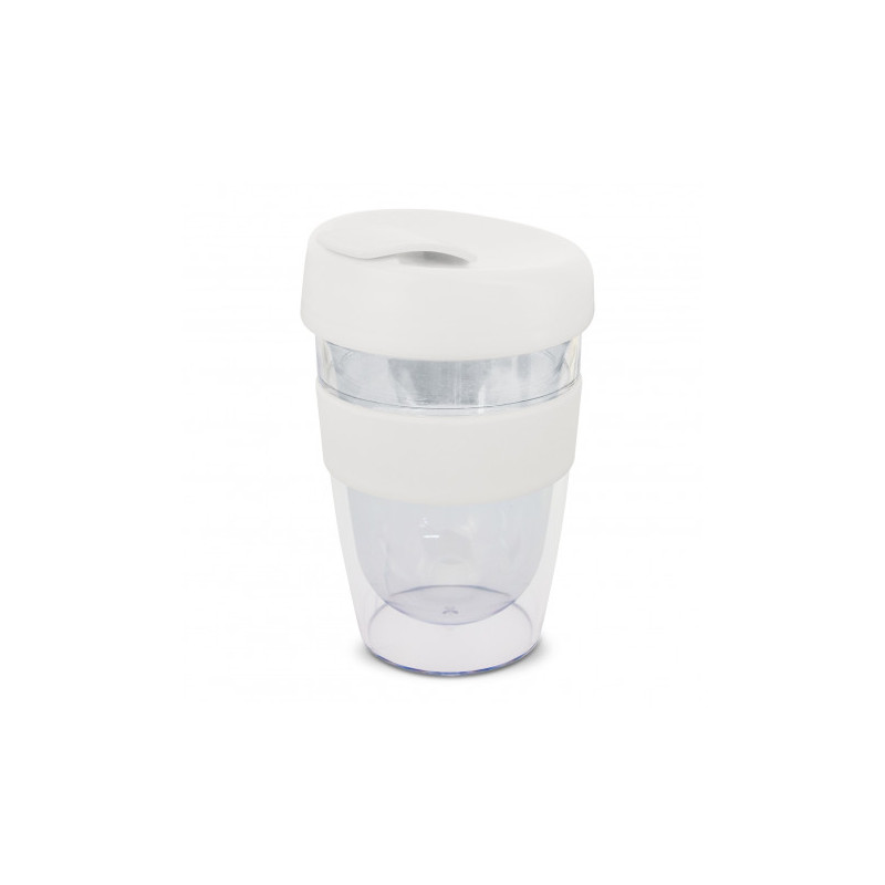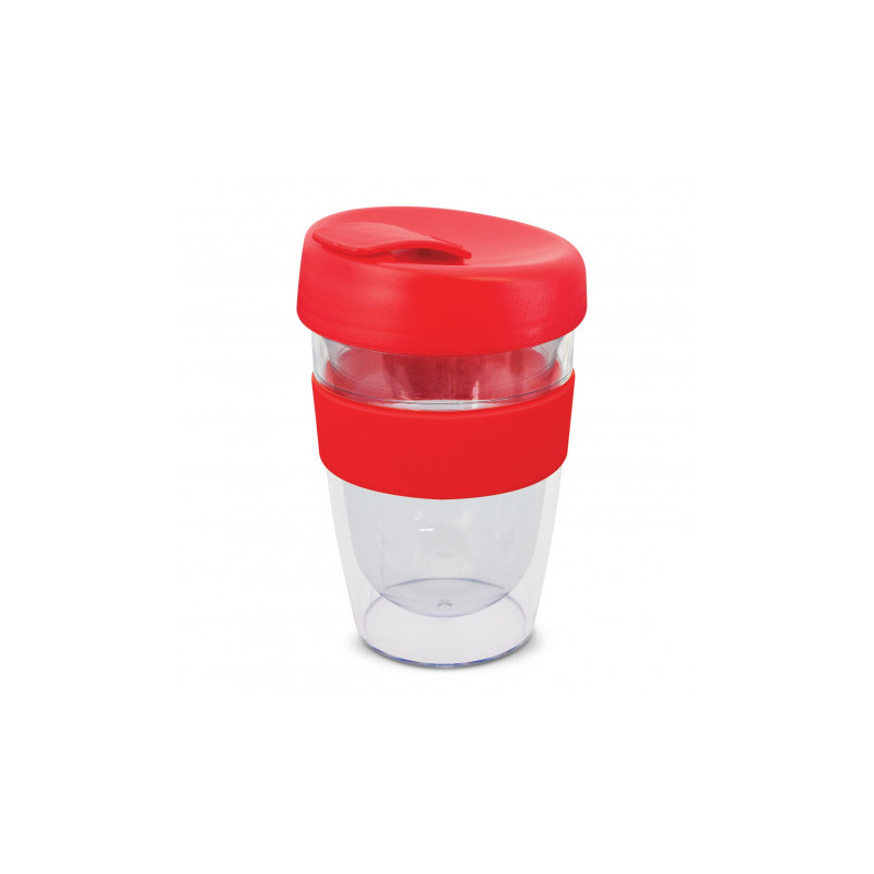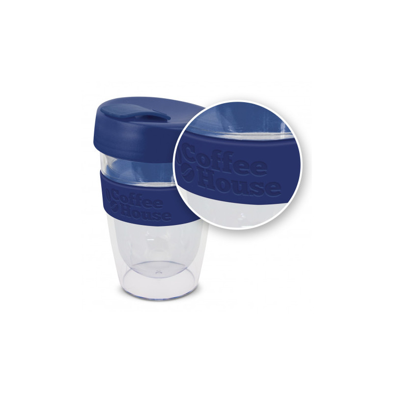 Reusable 230ml double wall coffee cup which will keep drinks hot for longer. It has a silicone band and a secure screw on lid with a splashproof flip closure. The cup is manufactured from crystal-clear AS plastic and the lid is polypropylene. Both materials are BPA-free. The lid, flip closure and band can be mixed and matched in any colour combination...