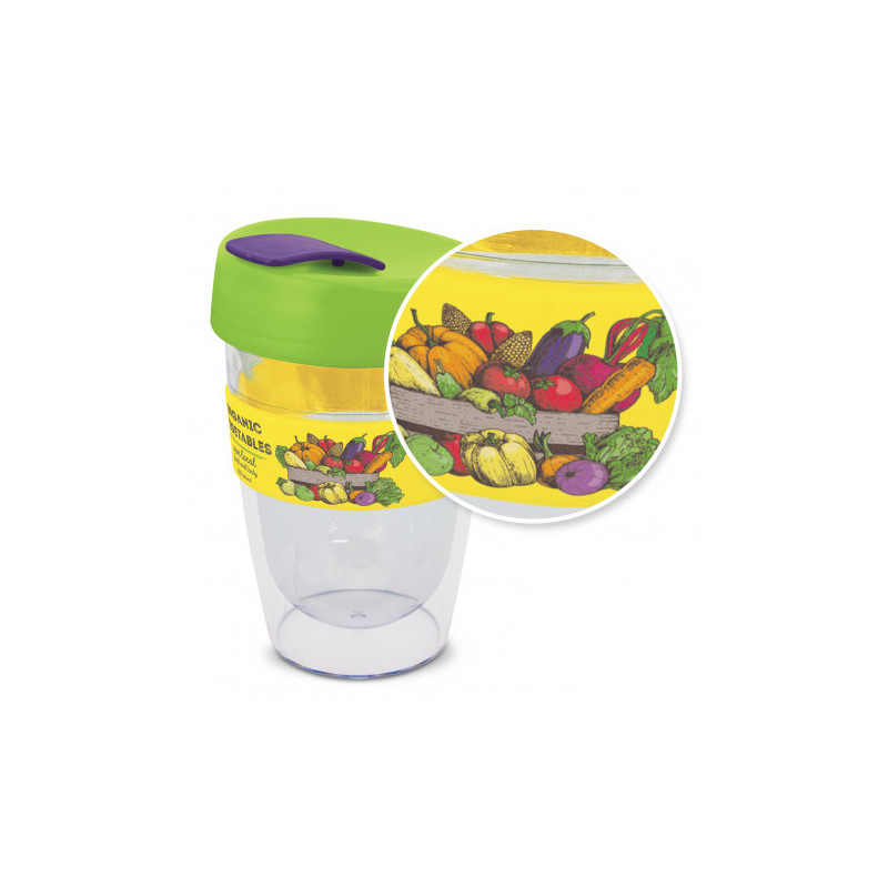 350ml double walled hot/cold cup with secure fitting comfort lid. BPA free. Microwave safe. These mugs have a coloured translucent outer layer over a solid white inner lining. For logo longevity, hand washing is recommended. Mix and match lid and cap colours. Eco Credentials: Reusable, sustainable, printed using renewable energy.