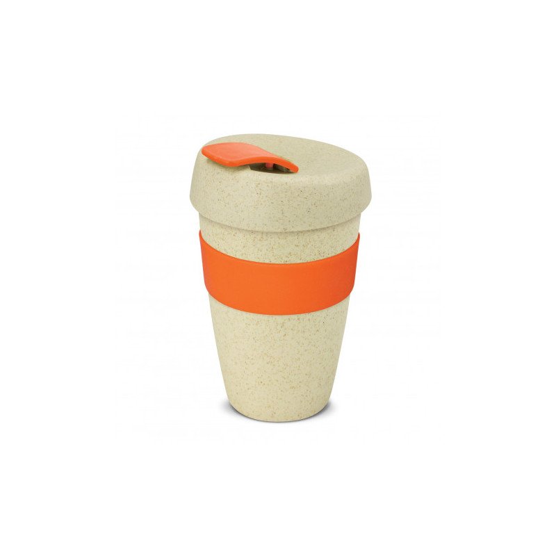This practical design of a reusable coffee cup is 350ml and comes with a heat resistant ribbed silicone band with a flat section for decoration. Made from 50% bamboo and 50% polypropylene.