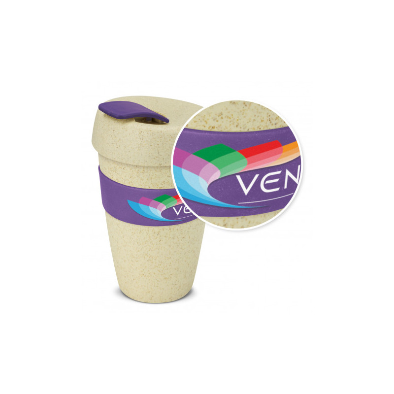 320ml reusable coffee cup. Made from 50% blend of wheat fibre and BPA free polypropylene. Includes heat resistant silicone sleeve and screw on lid. Select your choice of flip lid and silicone sleeve colours. For logo longevity hand washing is recommended. Eco Credentials: Reusable, sustainable, printed using renewable energy.