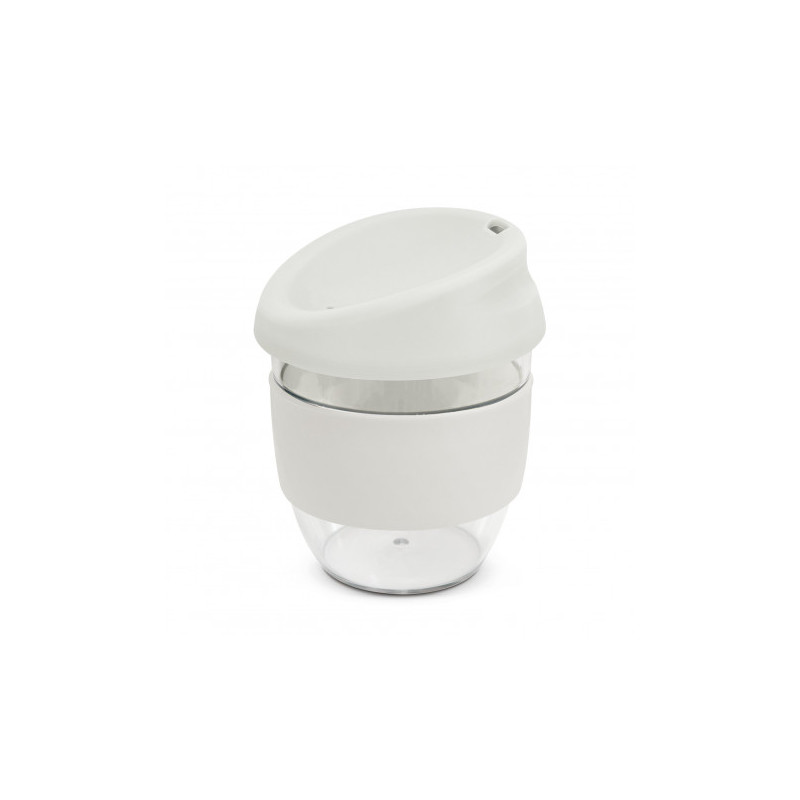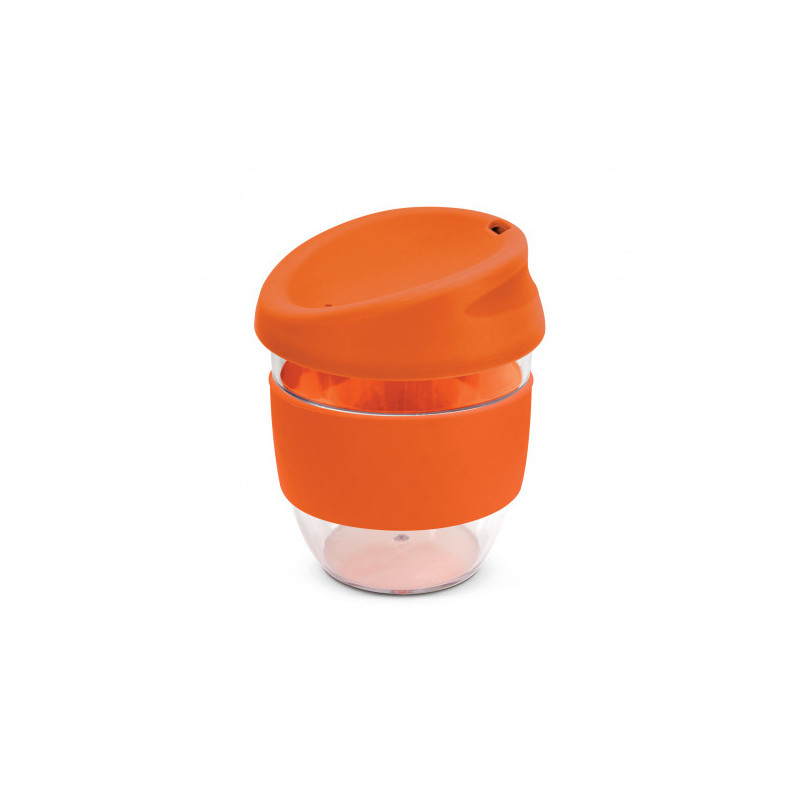 Reusable 230ml double wall coffee cup which will keep drinks hot for longer. It has a silicone band and a secure screw on lid with a splashproof flip closure. The cup is manufactured from crystal-clear AS plastic and the lid is polypropylene. Both materials are BPA-free. The lid, flip closure and band can be mixed and matched in any colour combination...