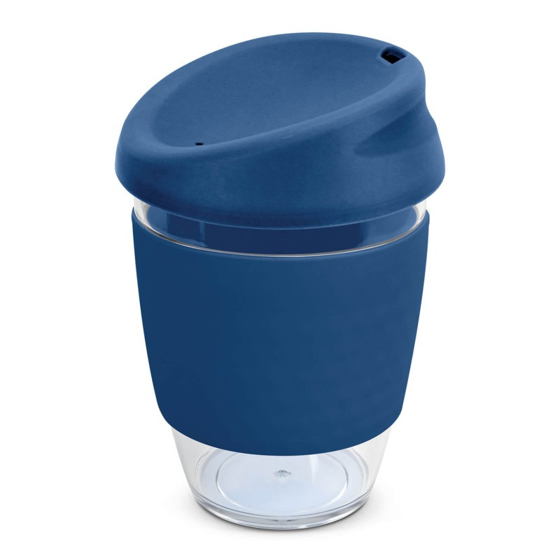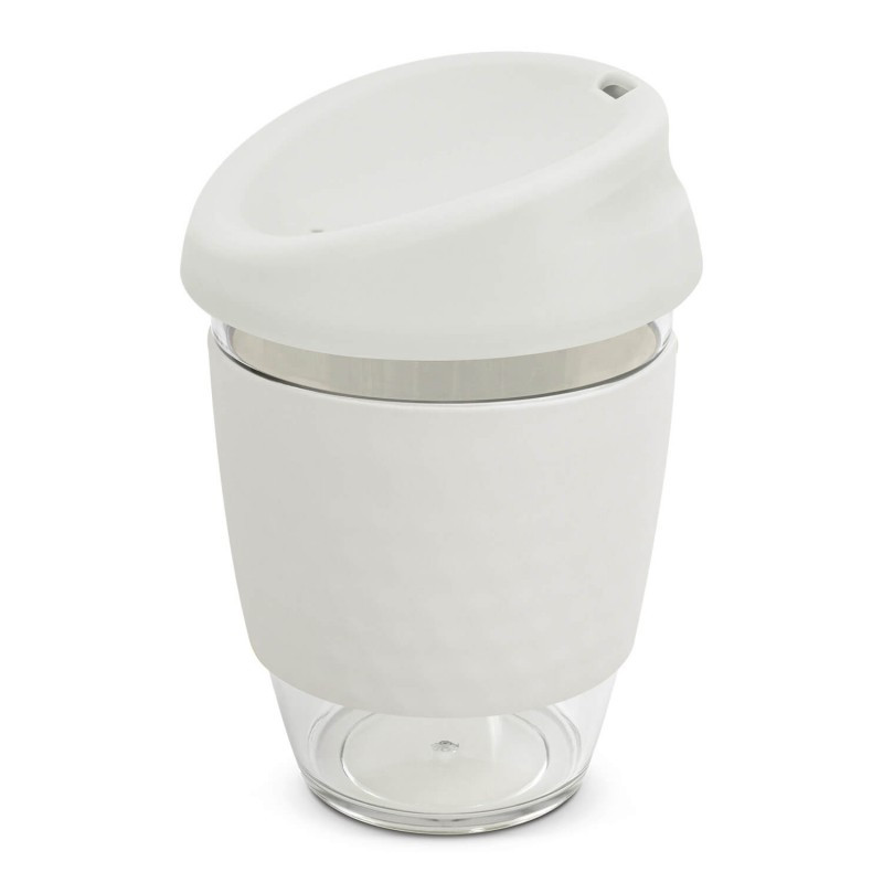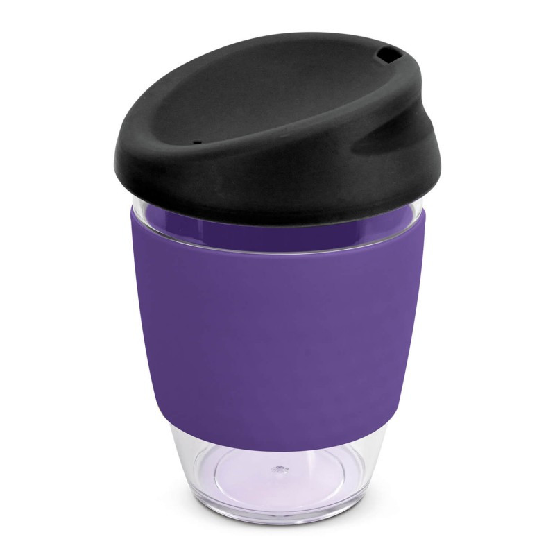 Reusable 230ml double wall coffee cup which will keep drinks hot for longer. It has a silicone band and a secure screw on lid with a splashproof flip closure. The cup is manufactured from crystal-clear AS plastic and the lid is polypropylene. Both materials are BPA-free. The lid, flip closure and band can be mixed and matched in any colour combination...