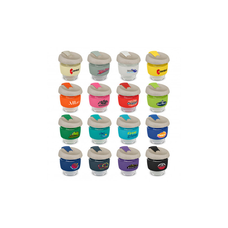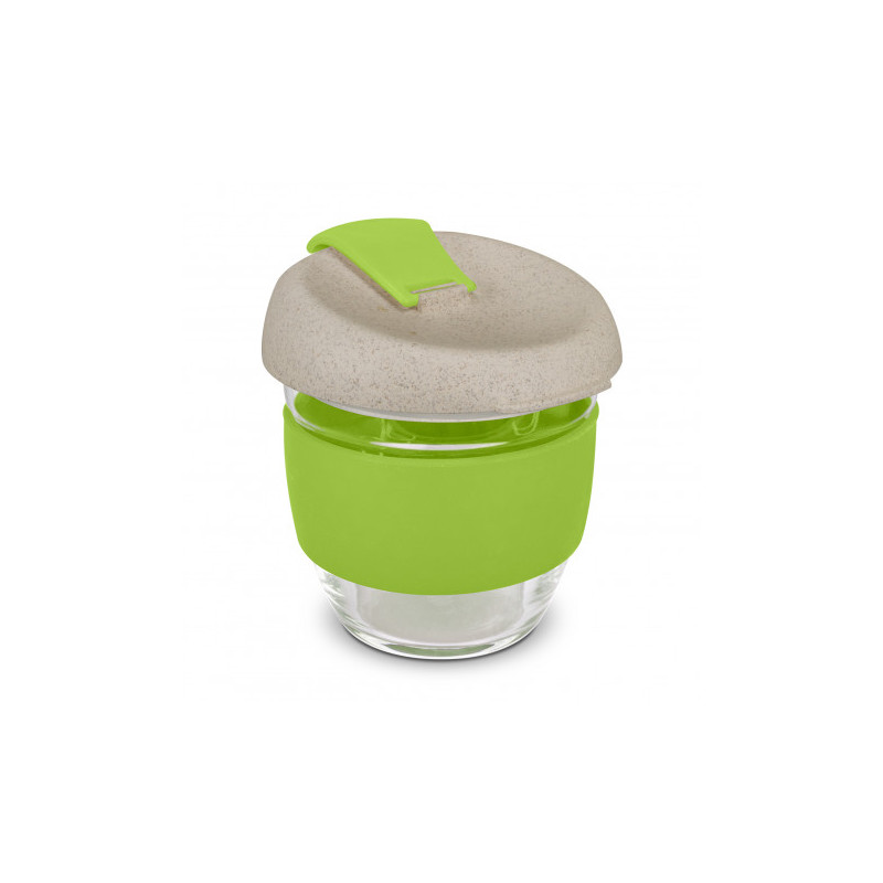 Glass single wall Karma Kups are a great new style of mug. Glass Karma Kups are available in a great range of colours you can mix and match all the colours of the bands and lids to create your special design. These mugs are supplied bulk packed or packed in a recycled container at additional charge.