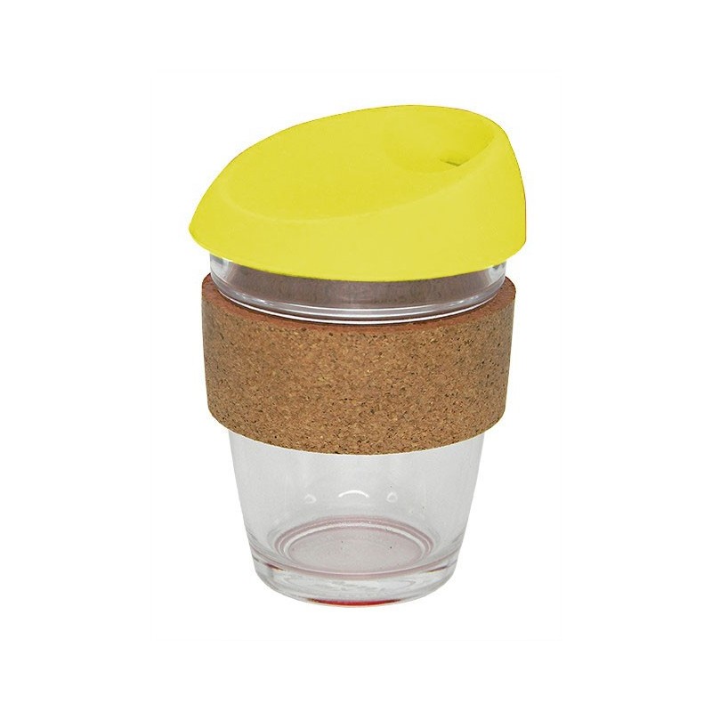 Minimum Order Quantities for Yellow 340ml Reusable Glass Karma Kup with Cork Band and Silicone Lid