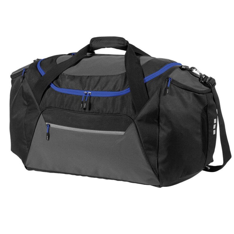 Robust large duffle bag which is manufactured from 300D polyester with decorative black zips and piping. It has a stunning blue internal with strong woven carry handles with a Velcro cuff and a woven shoulder strap that is adjustable and removable. Selwyn has four zippered external pockets, two of which is a shoe bag that can also be used for wet gym gear...