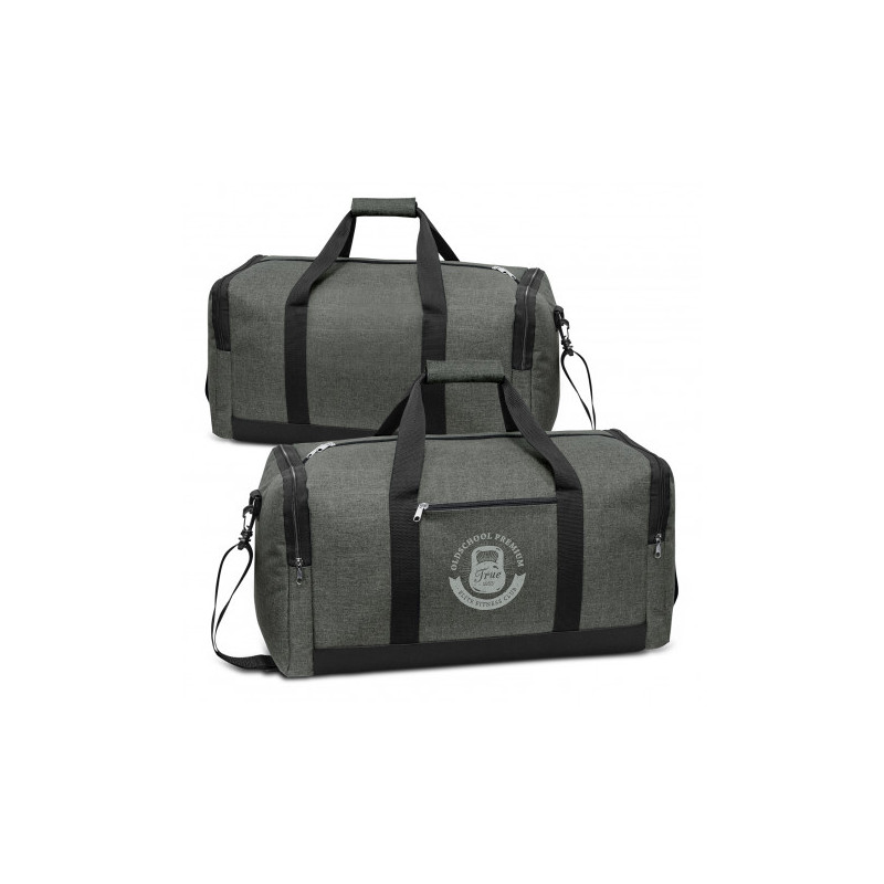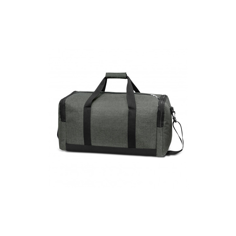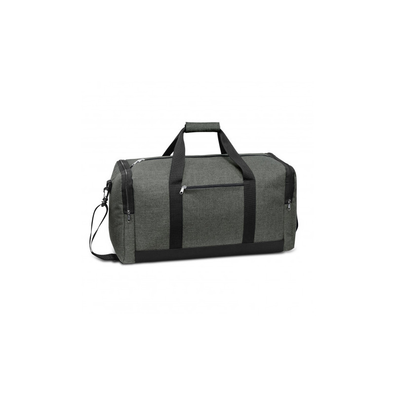 Carry on size duffle bag which is manufactured from polyester with an on-trend heather style finish. It has woven carry handles with a Velcro cuff and an adjustable woven shoulder strap which is removable. Other features include a front pocket, and two zippered side pockets.