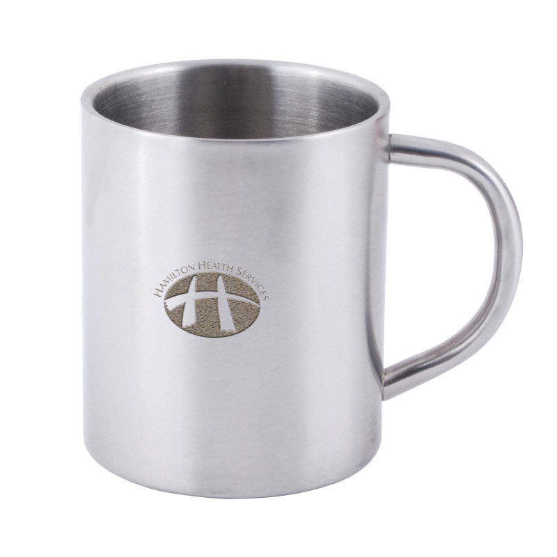 Classic 250 ml double wall vacuum insulated stainless steel coffee or tea mug with carabiner style handle, a great promotional product for camping and outdoor activities. BPA free and engraves to a natural etch.