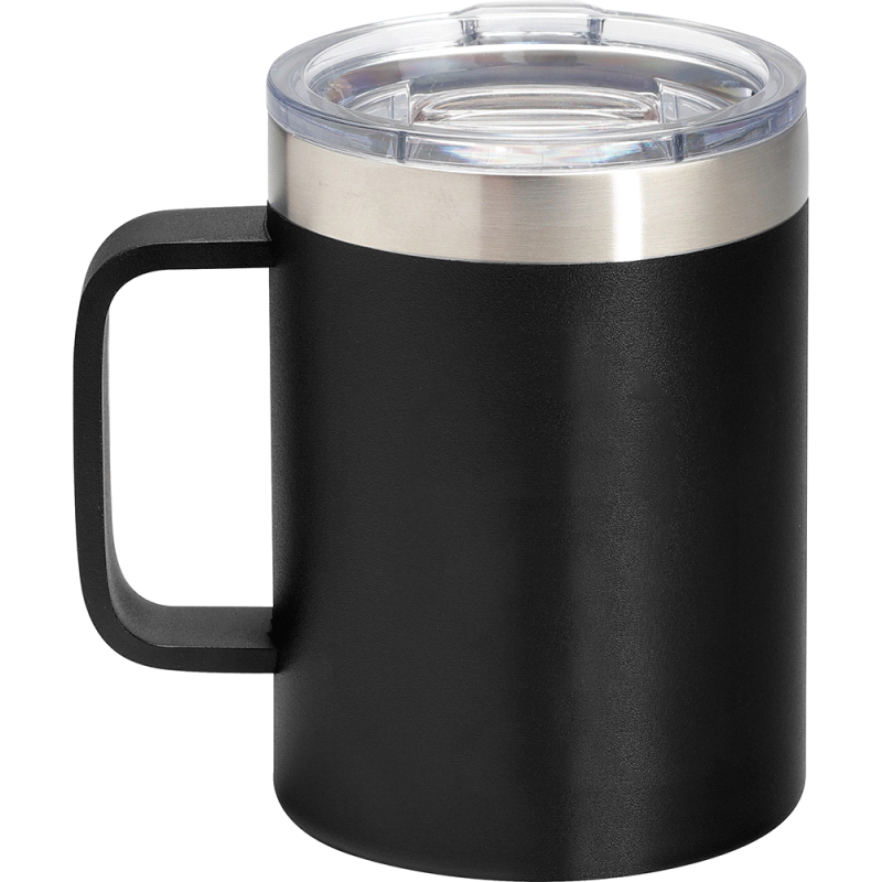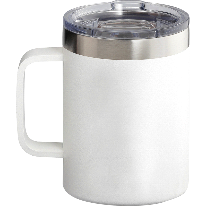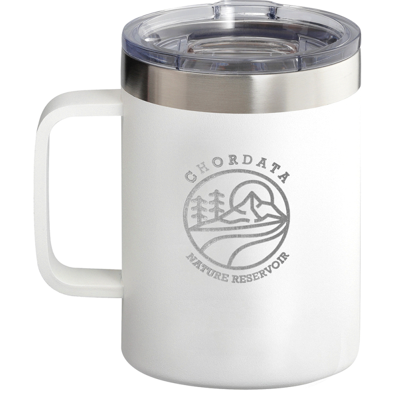 Classic 250 ml double wall vacuum insulated stainless steel coffee or tea mug with carabiner style handle, a great promotional product for camping and outdoor activities. BPA free and engraves to a natural etch.