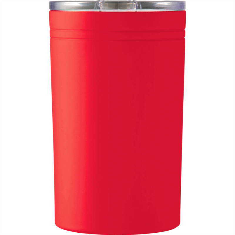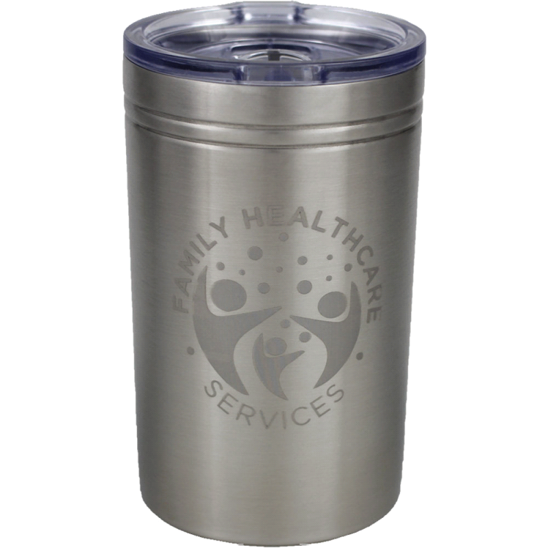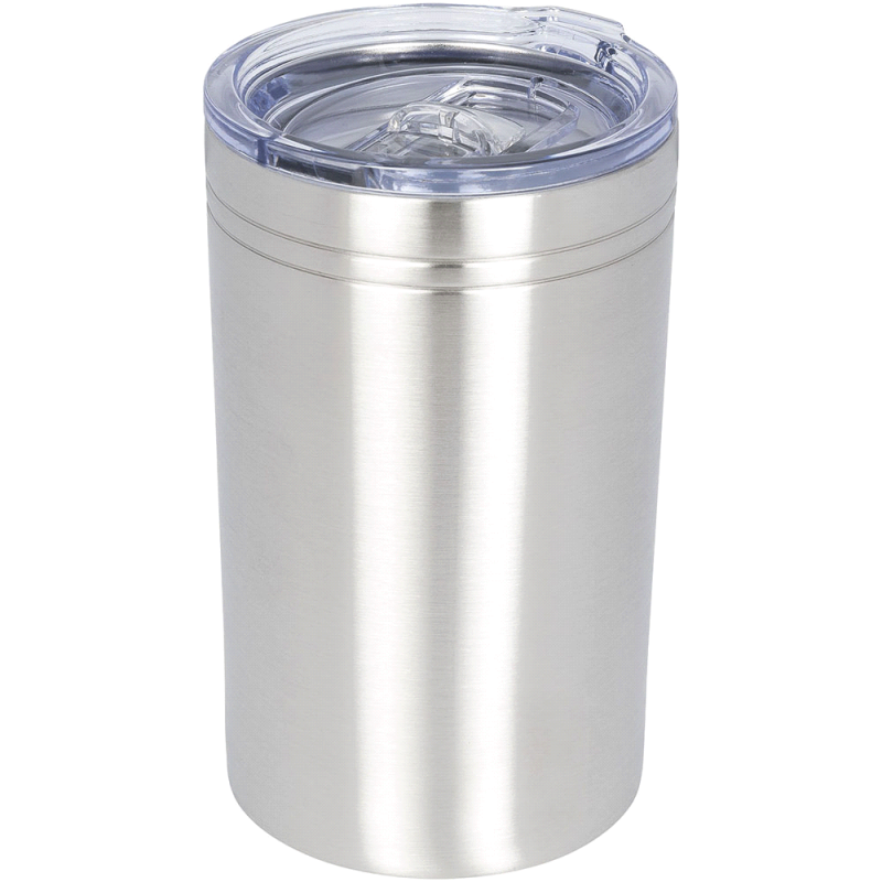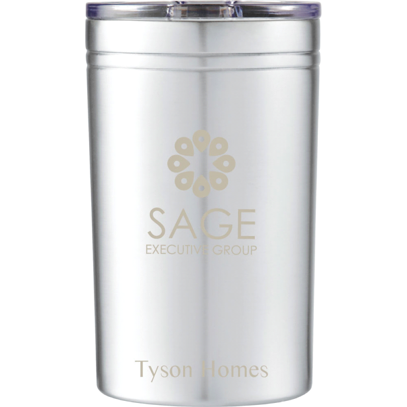 A 473ml double wall constructed tumbler with a plastic interior, a stainless steel exterior and a spill resistant lock top lid.