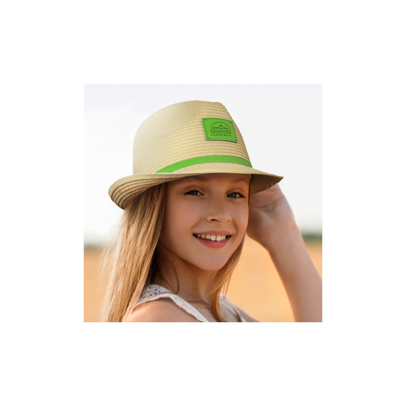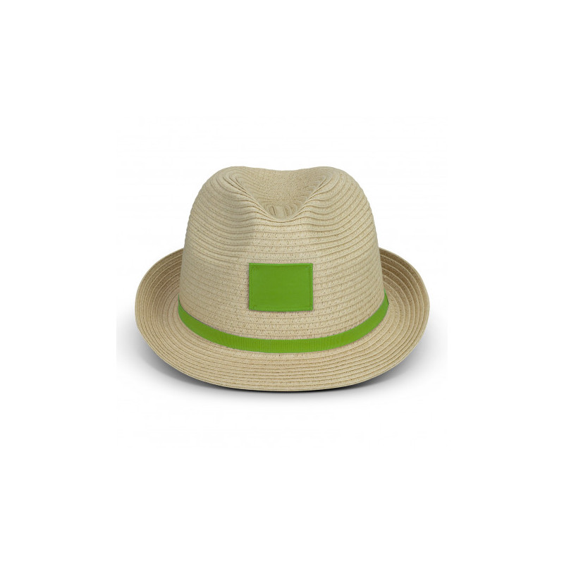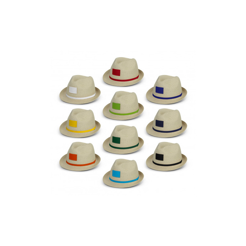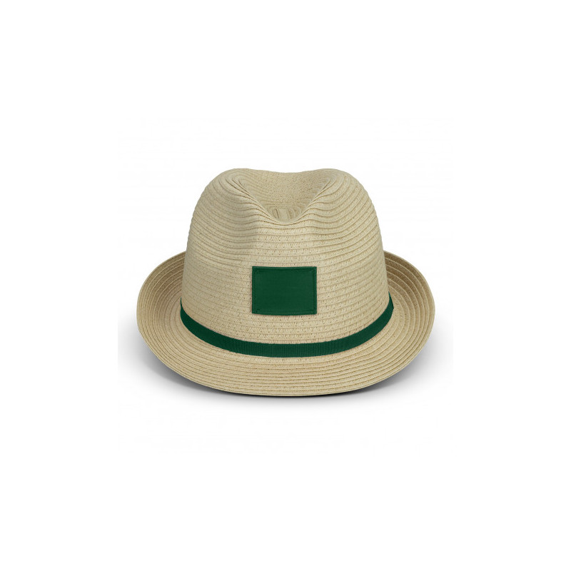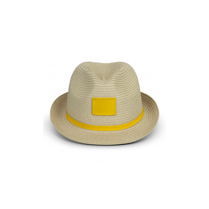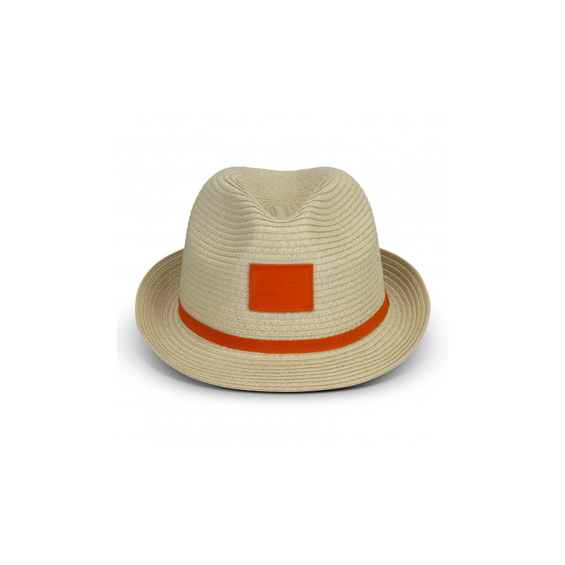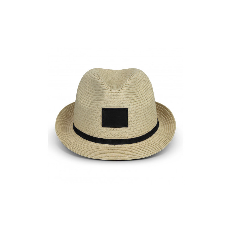 Classic straw fedora with a coloured polyester ribbon and a polyester patch for convenient and prominent branding.