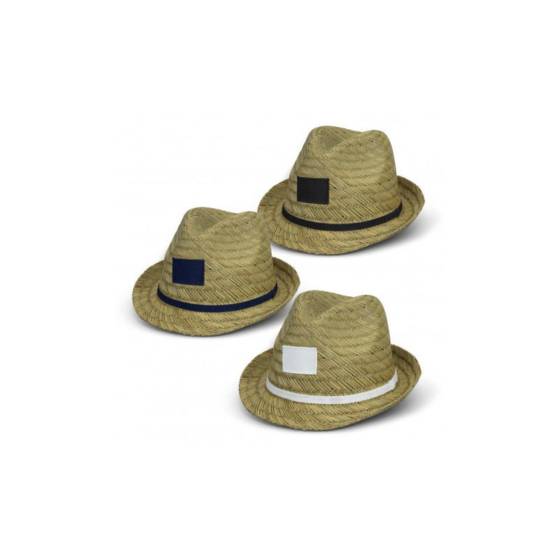 Classic paper weave fedora hat with a coloured polyester ribbon which features a patch for convenient and prominent branding.